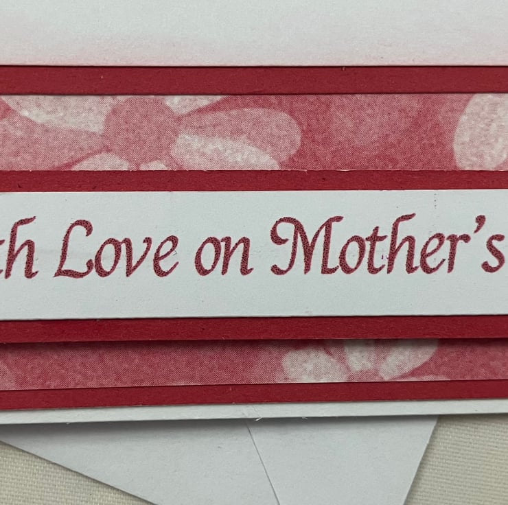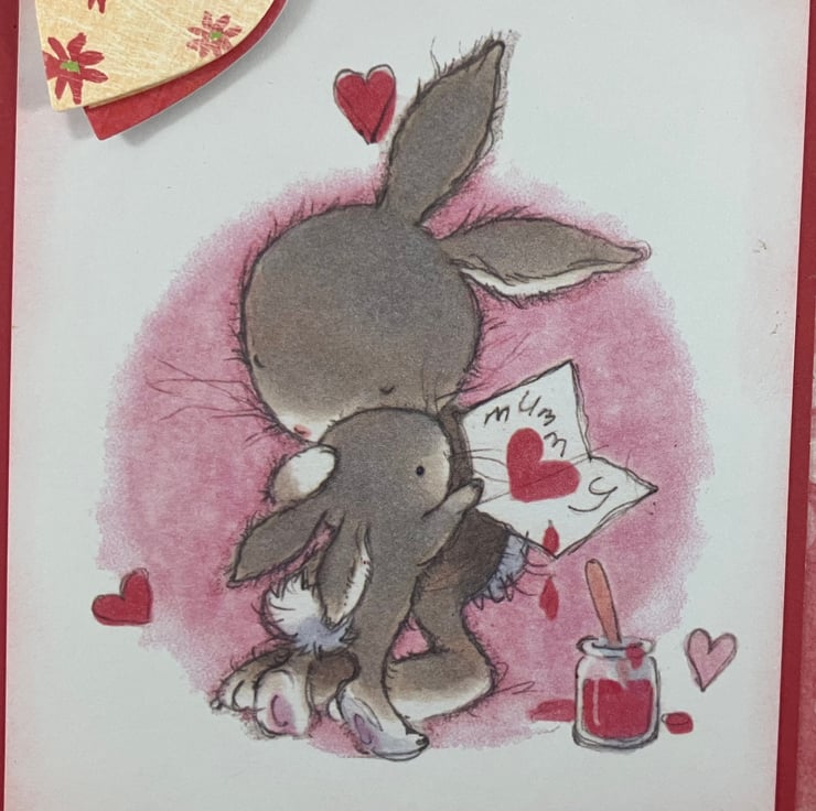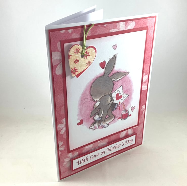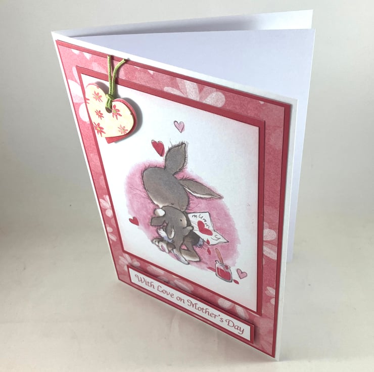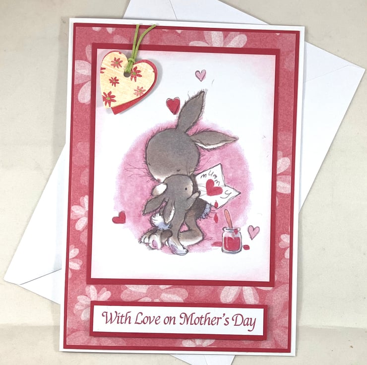 Handmade Mother's Day card featuring a printed image of a baby bunny giving her mother a hug and a card. The image has been edged with pink distress ink and mounted onto red card, over a red and white floral background. The sentiment 'With Love on Mother's Day' has also been mounted onto red card and the card is finished with a double heart embellishment.