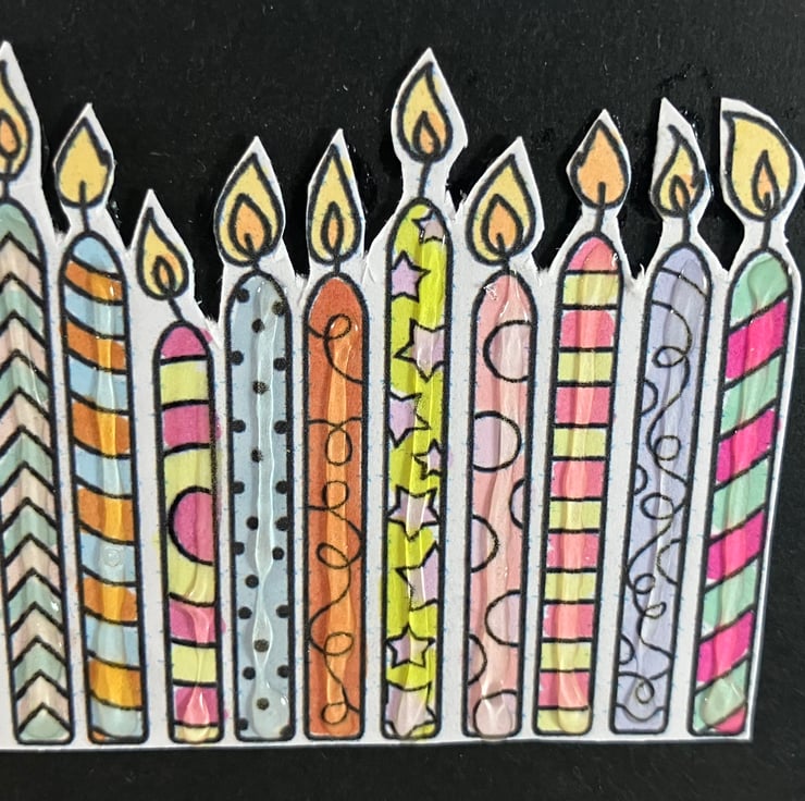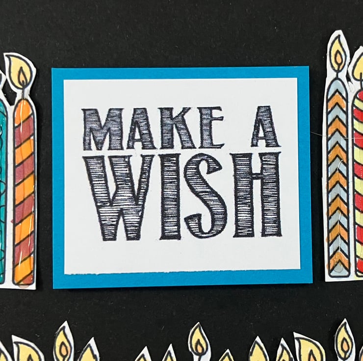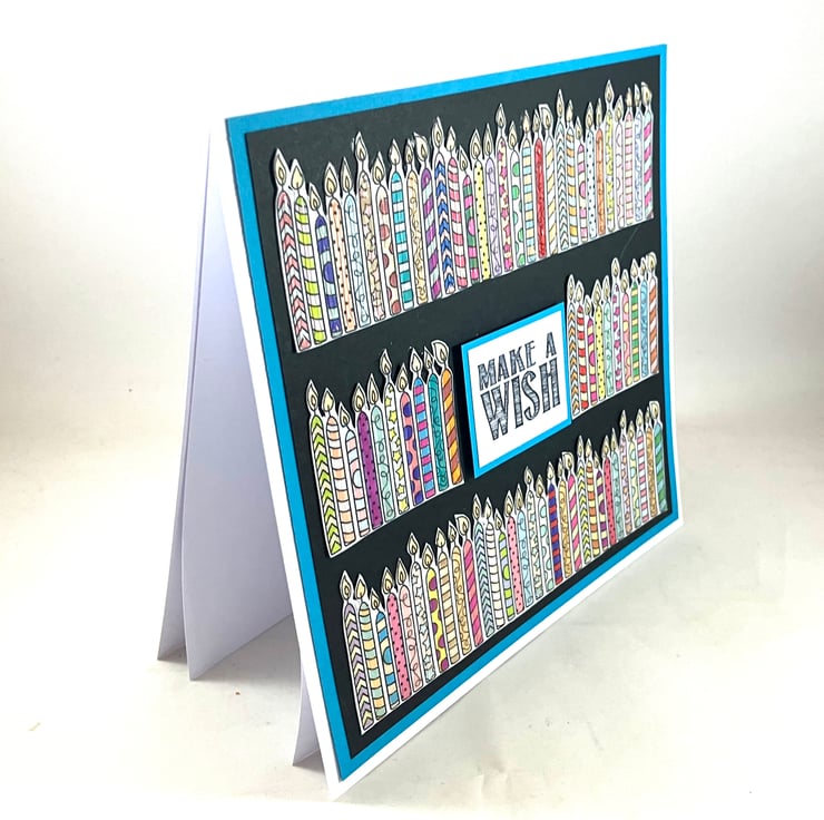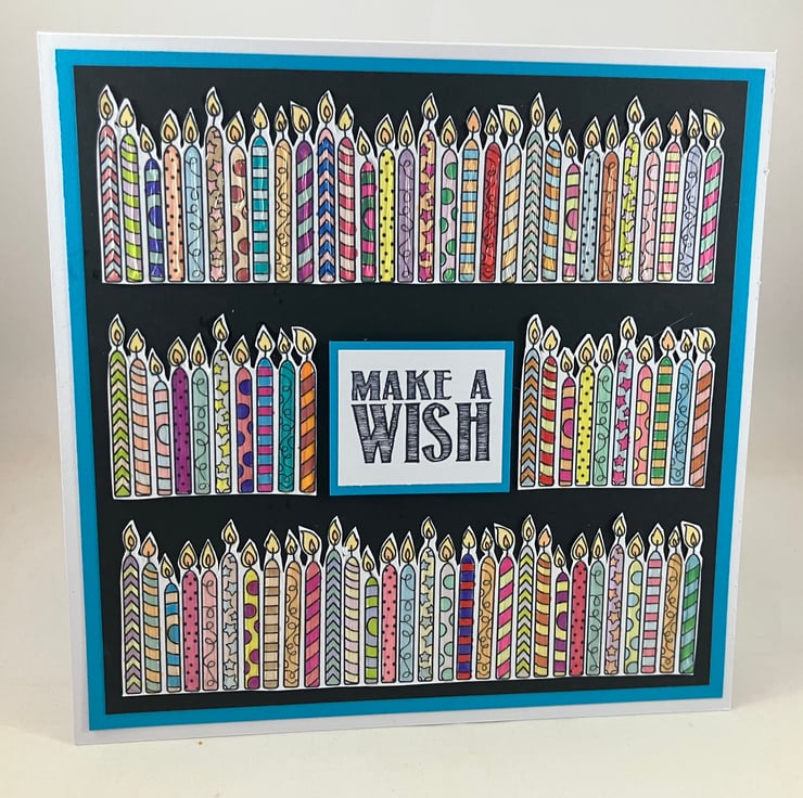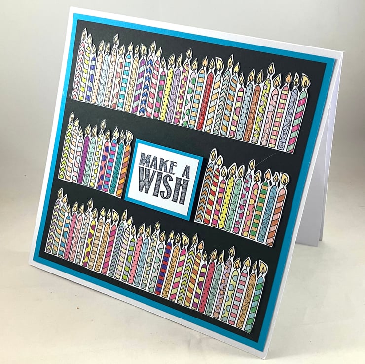 Large square birthday card featuring 80 hand coloured candles in bright colours and finished with clear gloss for a 3d feel. The sentiment reads 'Make a Wish' and has been mounted onto bright blue card over a black background.