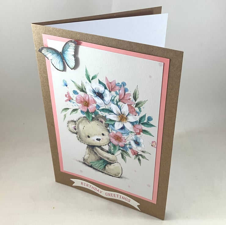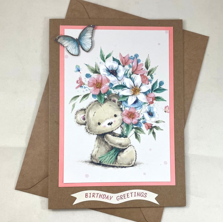 Kraft birthday card featuring a printed image of a bear holding a bouquet of flowers. The image has been mounted onto pink card and embellished with a butterfly. The centres of the flowers have been glittered.