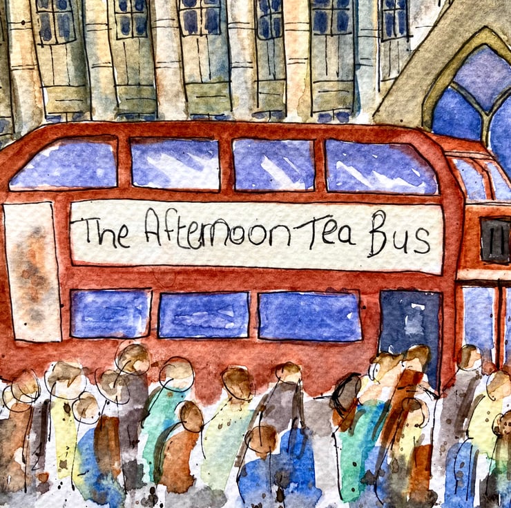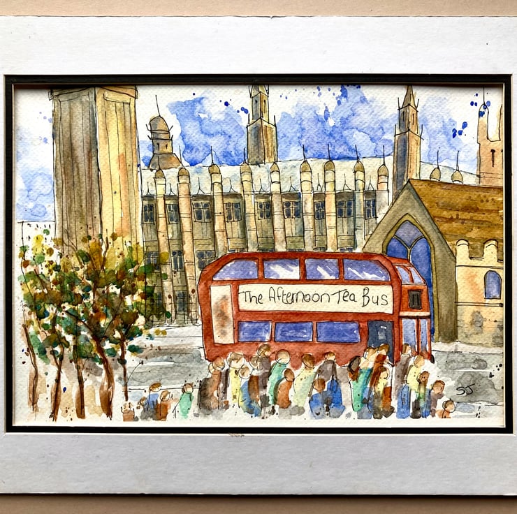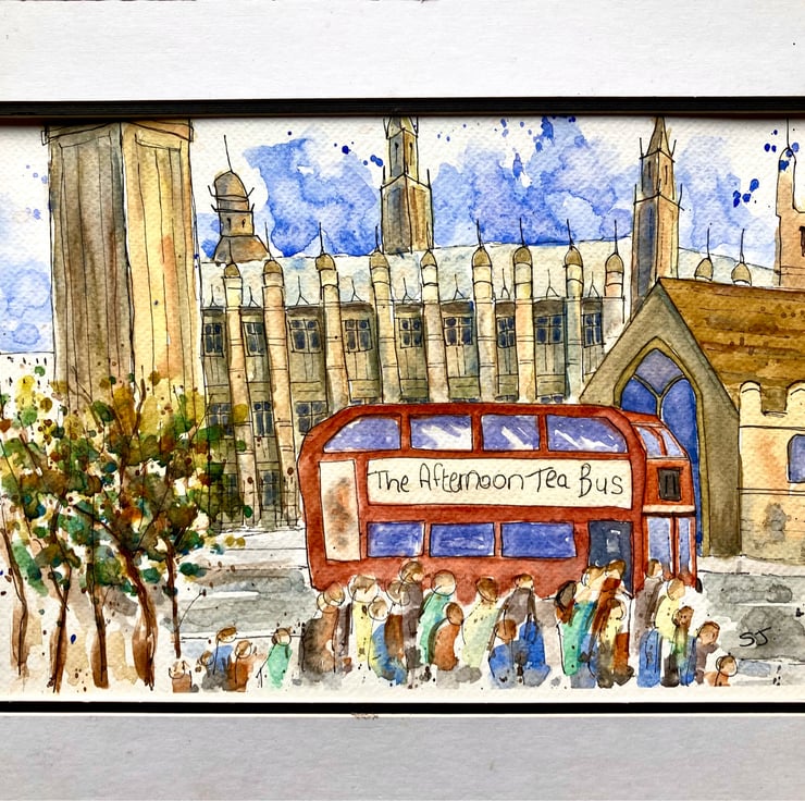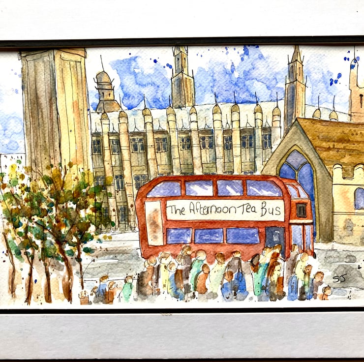 This is a colourful and fun urban sketch of Westminster and Big Ben, with a Red London Bus that serve afternoon tea with a tour thrown in! I love this one because it told a great story about the hustle and bustle of London life!