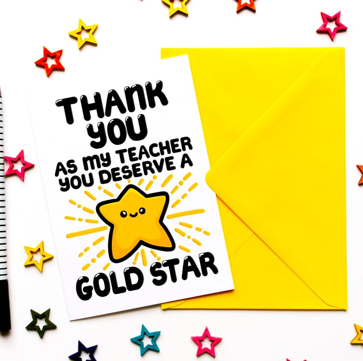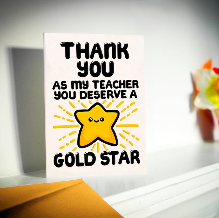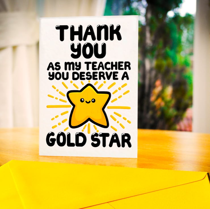 Greeting on front: THANK YOU AS MY TEACHER YOU DESERVE A GOLD STAR
