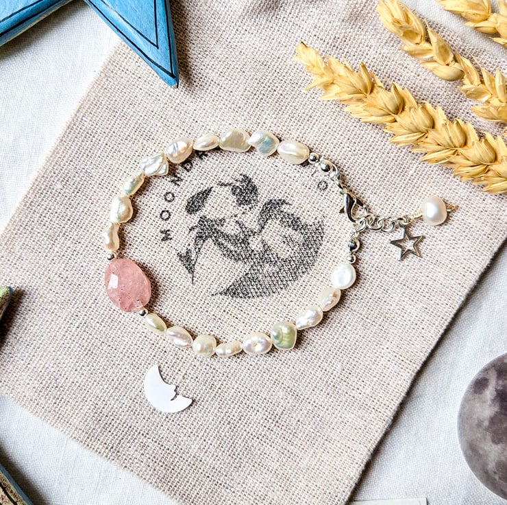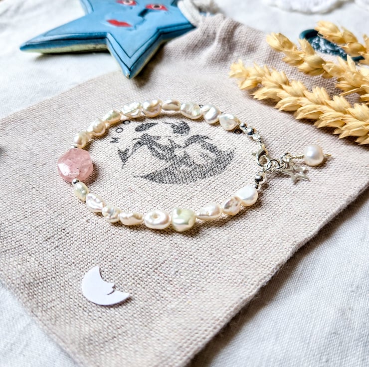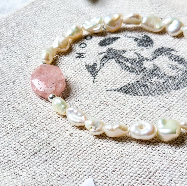This lovely little one-off bracelet is handmade with creamy baroque Freshwater Pearls and a soft, faceted Strawberry Quartz gemstone as the focal bead.