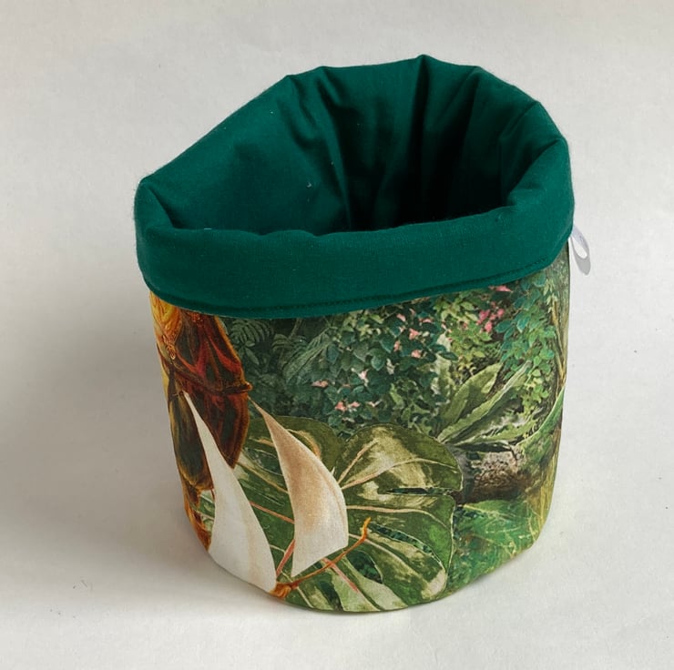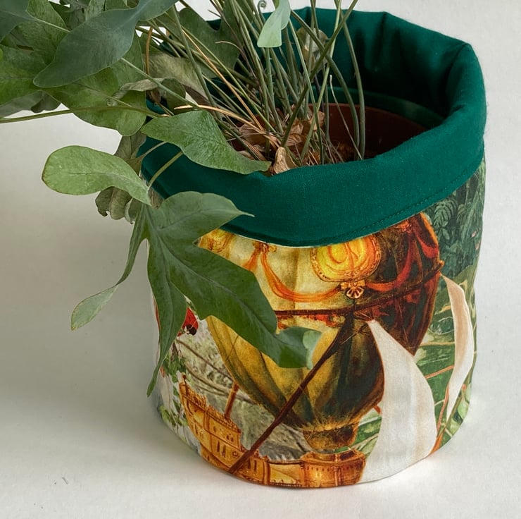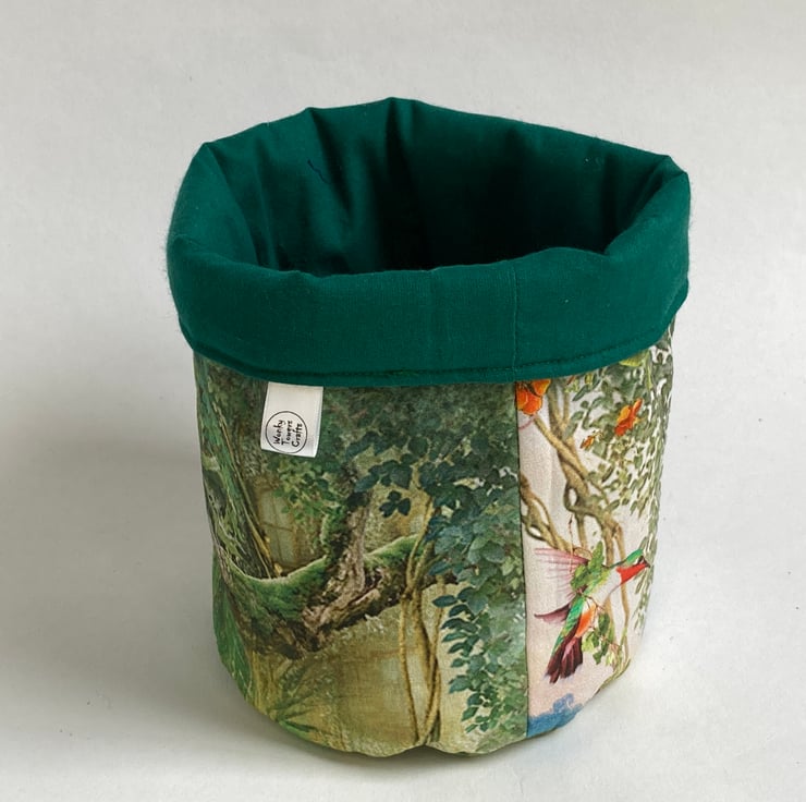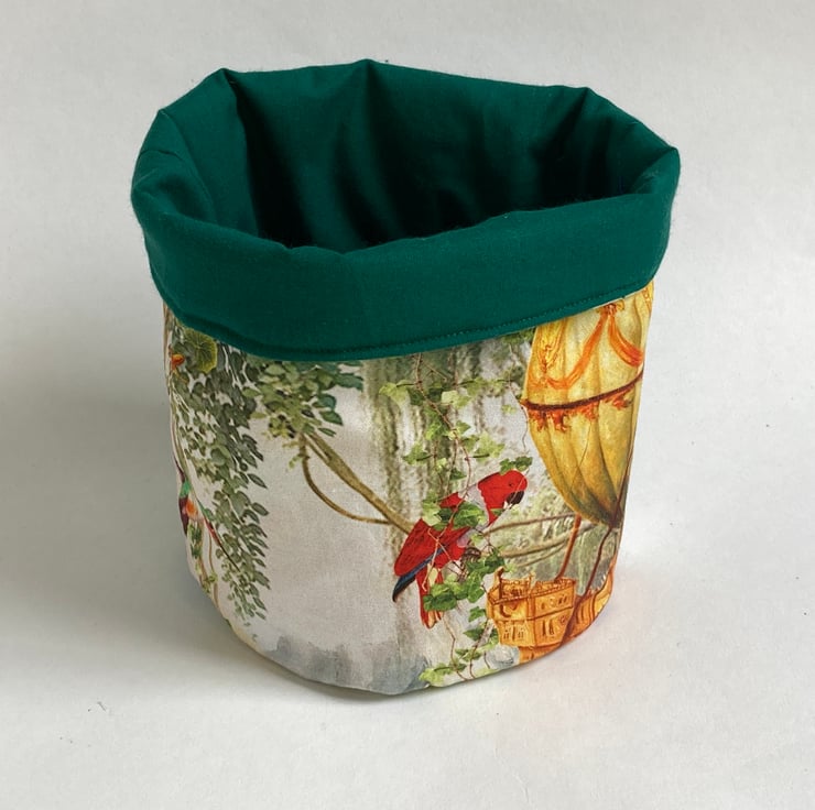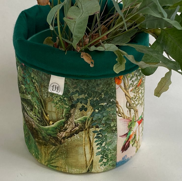 The basket is made from remnants of cotton fabrics. One side is decorated with a tropical design, showing plants, birds and a hot air balloon. The other side is plain bottle green. Sandwiched between the two is a layer of wadding to give structure. Choose which side you want to display. It measures approximately 14cm in diameter and 16 cm high with the top folded down. It will accommodate a 14cm plant saucer - something that is necessary if you decide to use this to hold a plant.