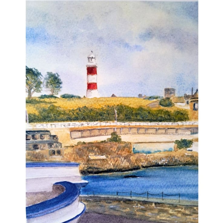 A professionally produced art print from my original watercolour painting of Plymouth Hoe, featuring Smeaton's Tower lighthouse and the Anthony Gormley Look II sculpture. Printed on durable high quality A4 paper.