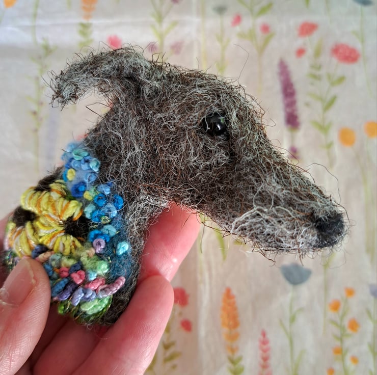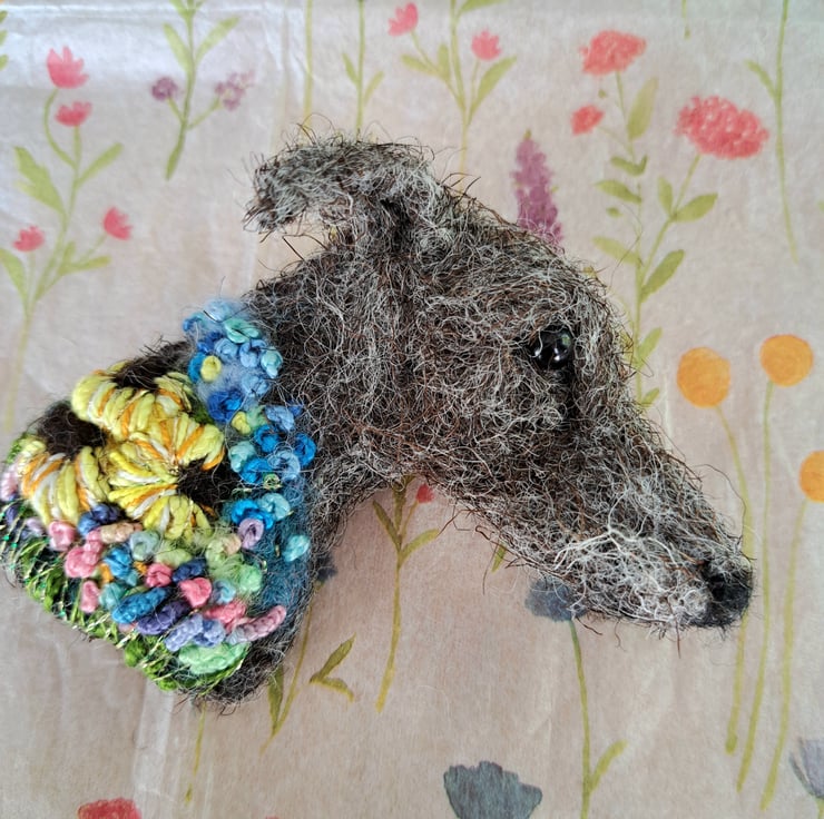 needle felted lurcher brooch,with embroidered details,approx 3 inches,metal brooch fitting to rear
