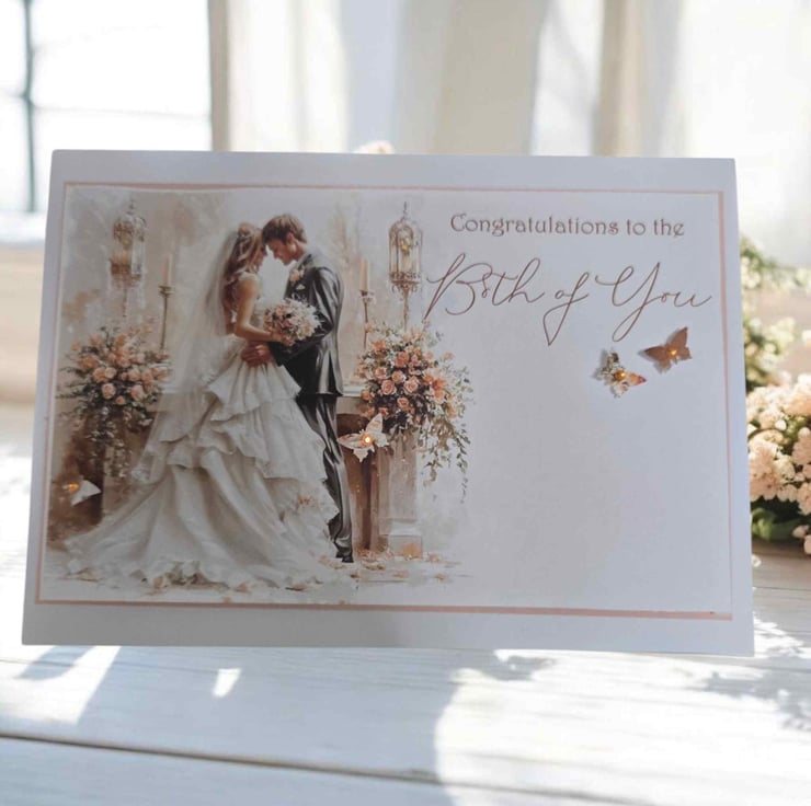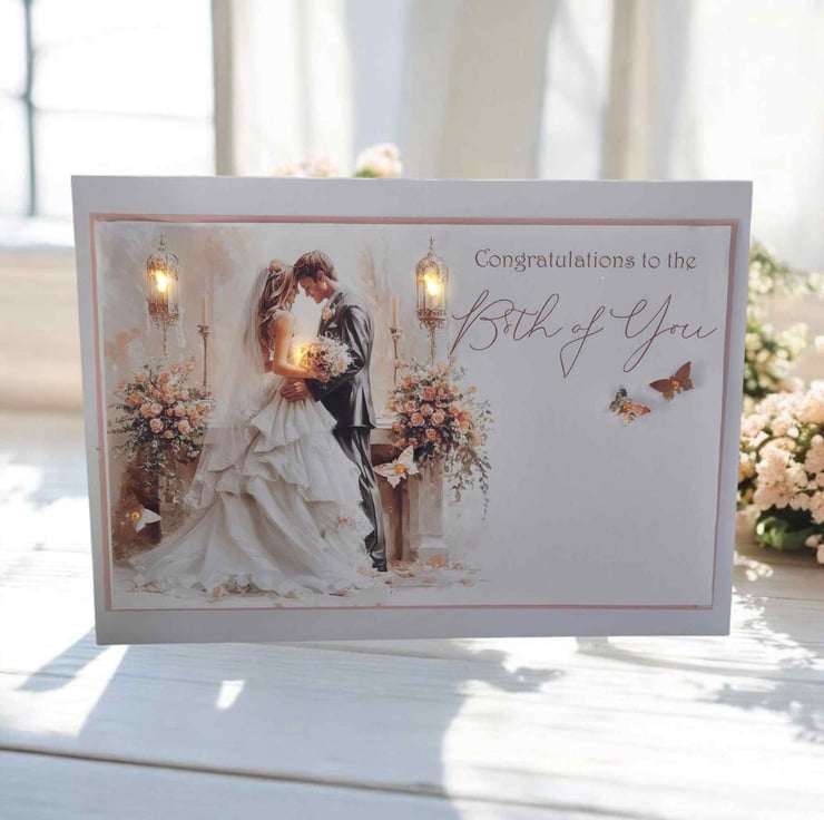 Personalised ‘Light Up’ Card - A5 Full Image Card-Bride & Groom. Beautiful Wedding Card for that Special Couple, which actually illuminates at the press of a button. With soft peaches and creams embellished with Butterflies and gemstones. This beautiful card comes in a box for protection, ready to be sent or given. Or can be sent directly to the recipient if preferred.