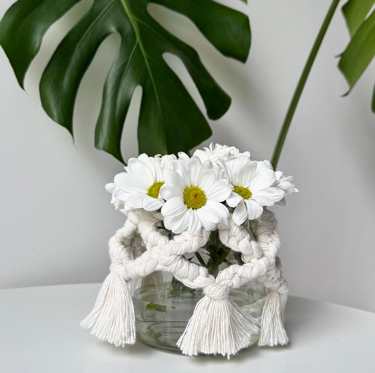 Bring a touch of handmade charm to your space with this upcycled glass jar, adorned in soft, natural cotton macramé. Each piece is carefully handcrafted using sustainable materials to create something both beautiful and eco-conscious.