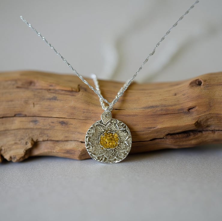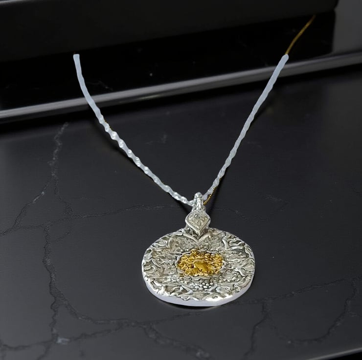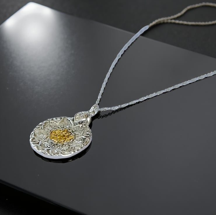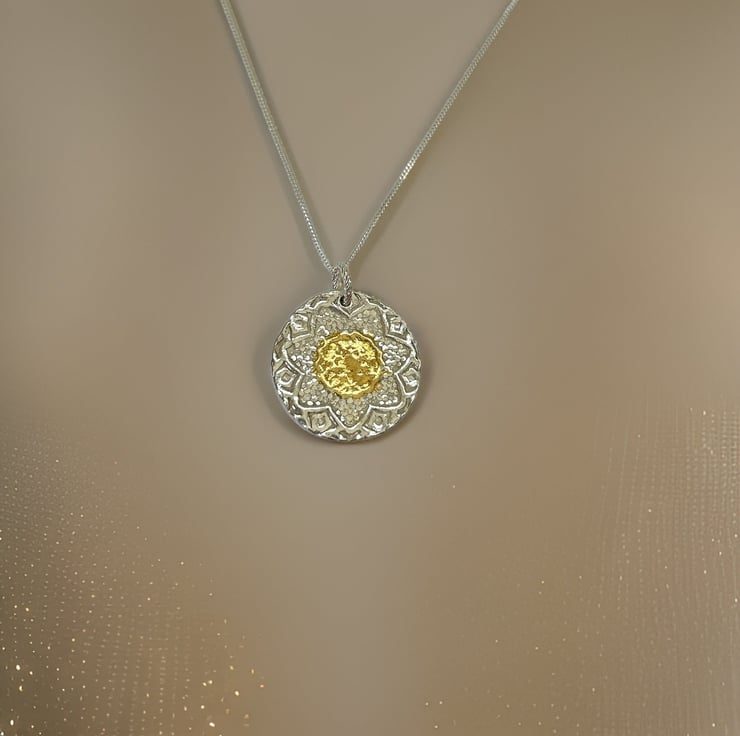 Handmade Fine Silver Pendant With GoExquisite silver and gold coin pendant is a true masterpiece for those who adore the fusion of silver and gold. This one-of-a-kind pendant is handcrafted with an artisanal technique, featuring intricate patterns and a touch of elegance with 24ct gold foil bonded onto the fine silver. This technique I use is called Keum-boo, an ancient Korean gilding technique, the pendant is suspended on a sterling silver chain. The size of the pendant is 20mm. Every piece handmade is unique.