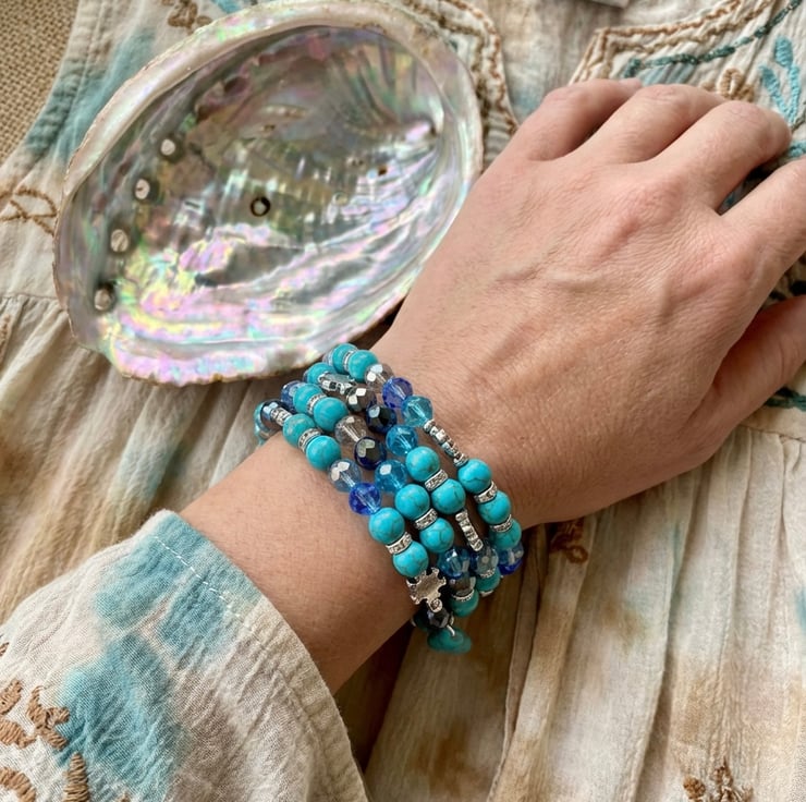 This stunning bracelet features 8mm Turquoise Howlite beads and sparkling Austrian faceted crystal beads, creating a chic illusion of stacked bracelets in one elegant piece. Adorned with charming Tibetan Silver turtles, it captures a delightful nautical theme, making it the perfect accessory for summer evenings. The bracelet comes beautifully gift-wrapped in tissue paper and a lovely organza bag, ready to delight someone special or to treat yourself!