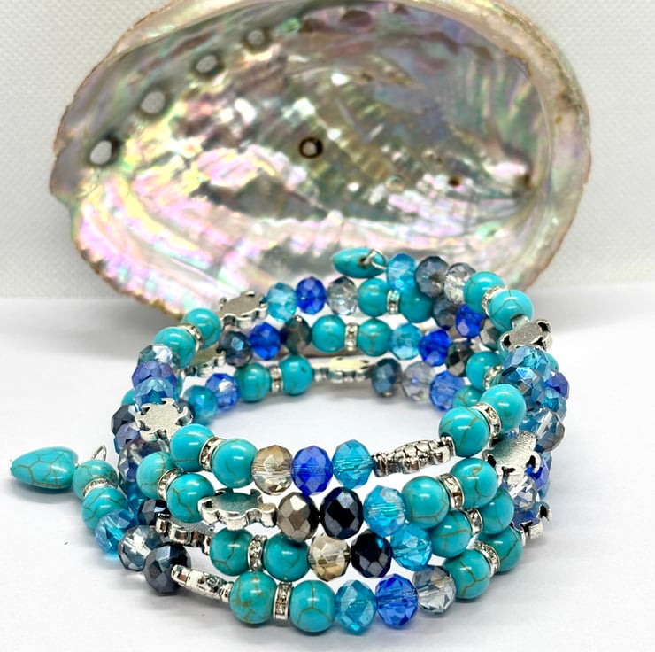 This stunning bracelet features 8mm Turquoise Howlite beads and sparkling Austrian faceted crystal beads, creating a chic illusion of stacked bracelets in one elegant piece. Adorned with charming Tibetan Silver turtles, it captures a delightful nautical theme, making it the perfect accessory for summer evenings. The bracelet comes beautifully gift-wrapped in tissue paper and a lovely organza bag, ready to delight someone special or to treat yourself!
