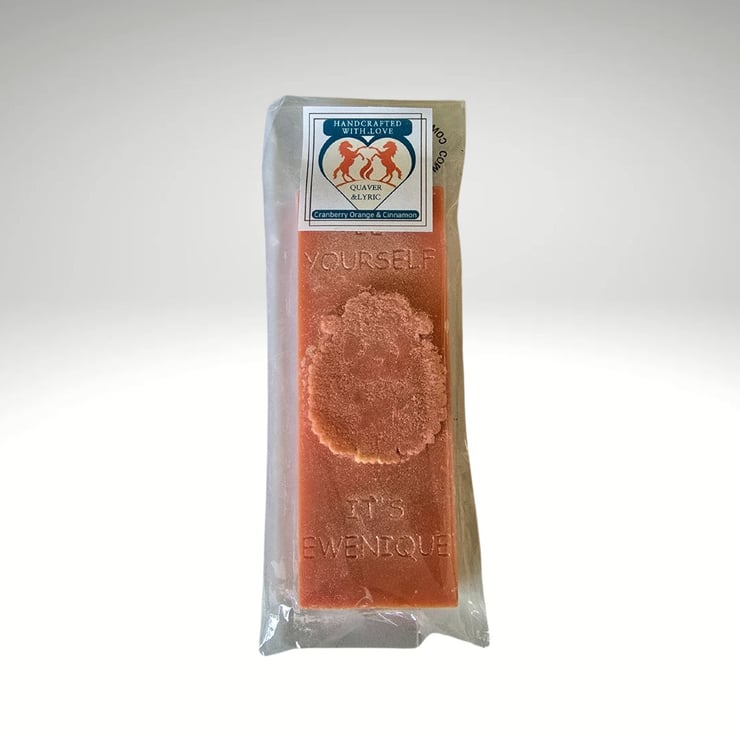 This brick red wax melt bar is fragranced with Cranberry, Orange and Cinnamon Fragrance: Cranberries and orange with cinnamon, jasmine, lily, sandalwood, cedarwood with a hint of musk and vanilla. A lovely festive scent which is also great all year round.
