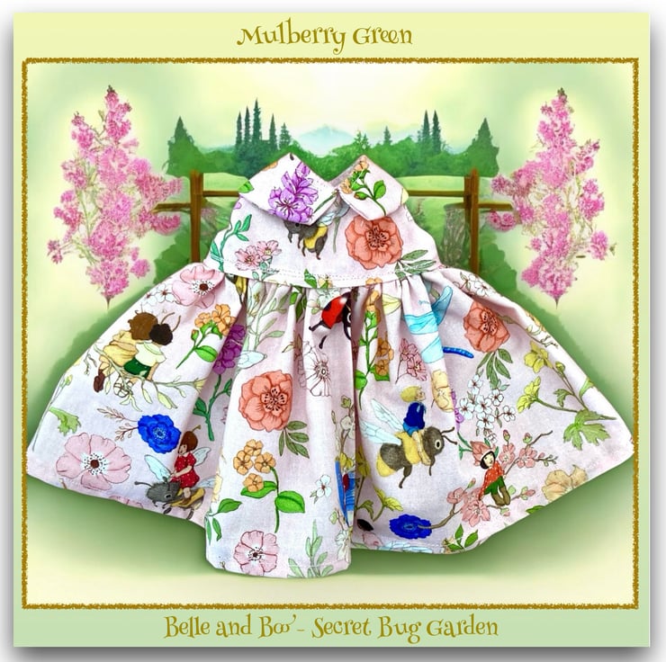 A pretty little pink dress in a Belle and Boo designer print - Secret Bug Garden, to fit the Mulberry Green characters. The dress is made from best quality cotton and has a Peter Pan collar and a lined bodice.