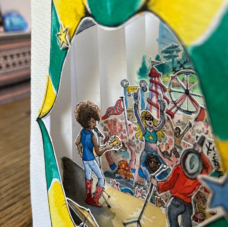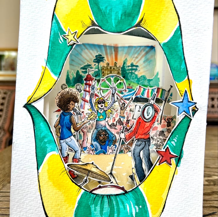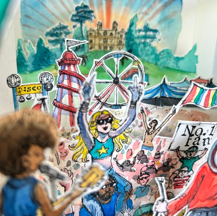A 3D illustrated scene, consisting of 6 separate layers carefully drawn, painted and then cut by hand and assembled, to create the perfect diorama. Soak up the festival vibes as you look out onto the crowd from the stage, across the funfair and towards the sun setting behind Wollaton Hall. Bursting with energy and quirky details, not all of which can be seen at first glance, this original piece of art will delight devotees of Splendour and music festivals alike.