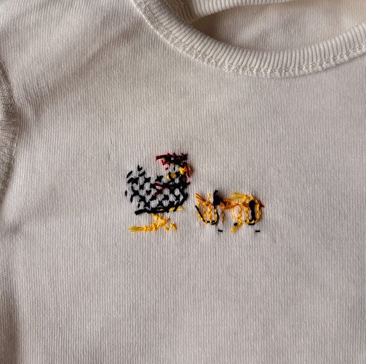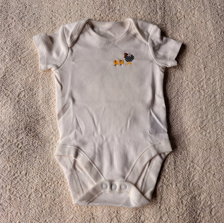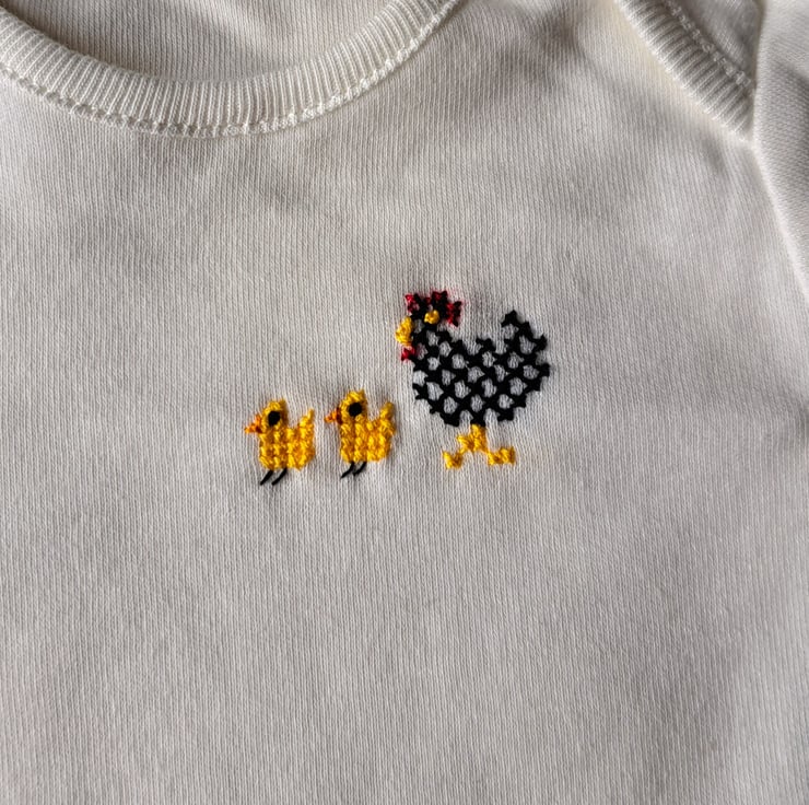 A black and white cross stitch hen follows her two little yellow chicks across the left front of this soft cream (not pure white) baby vest/onesie. As I never use a permanent backing material when hand embroidering kids' clothing, there is nothing inside to irritate your child's skin. The vest has short sleeves, an envelope neck and three press studs between the leg openings. It is all cotton and can be machine washed.