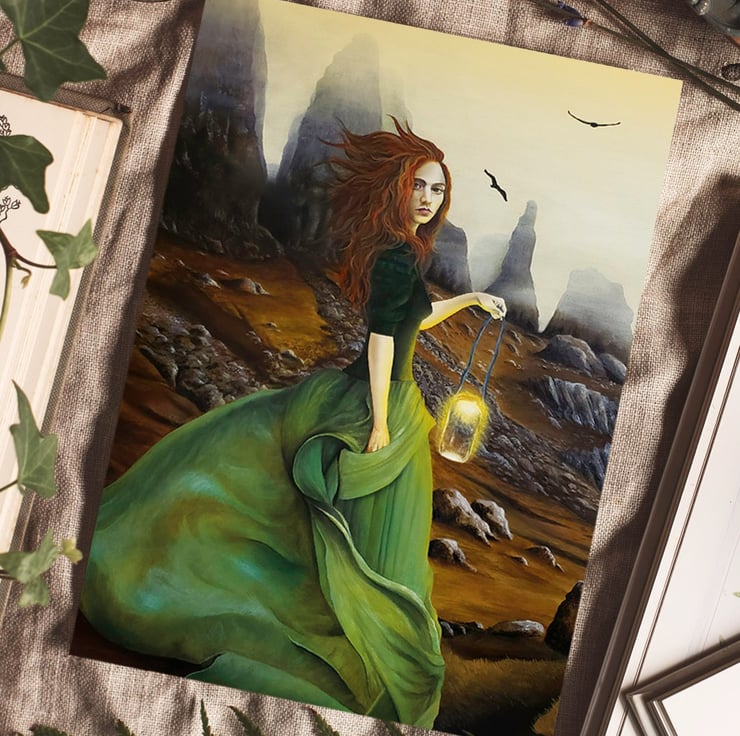 Beautiful 5x7 card (blank inside). Taken from my original painting, "Storr," it portrays a mysterious woman in green carrying a lit lantern through the famous Old Man of Storr rock formation on the Isle of Skye. The card is printed on heavy cardstock and the lantern has been whimsically hand touched with glitter. All cards are individually celo wrapped and include a kraft envelope with a beautiful gold foil seal sticker...just for that extra touch.