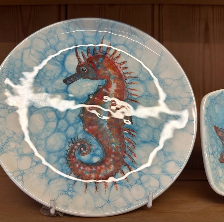 Side Plate 20cm diameter. Food, Dishwasher and Microwave safe. The plate is produced from White Earthenware. The plate is painted with a Snub nosed seahorse and finished with a special bubble glaze. These are hand sketched, transferred to the pottery and hand painted with underglaze paints, these are one off original pieces, and are not reproduced.
