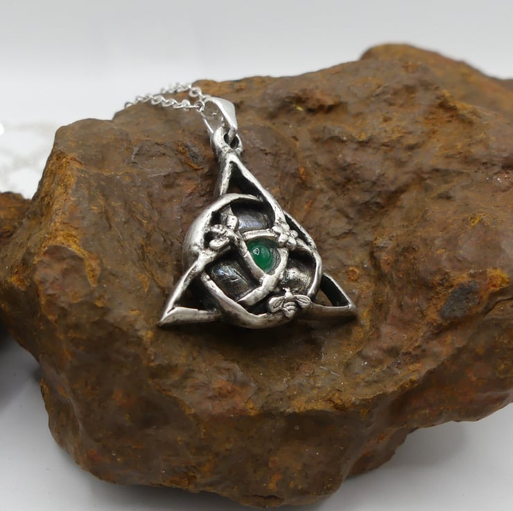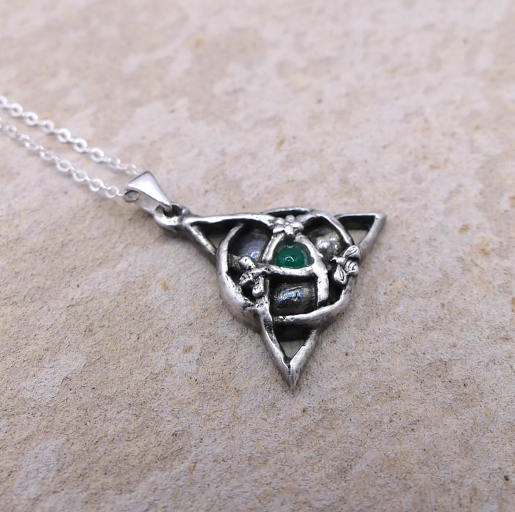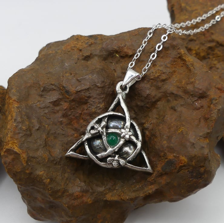 Sterling Silver Triquetra and Bees with Green Onyx Gemstone Pendant Necklace.