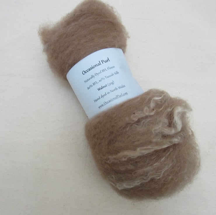 40g beautifully soft Blue Faced Leicester fleece, blended with 10g delicate tussah silk, carefully dyed with locally gathered walnut shells to give a range of light and delicate shades of brown.