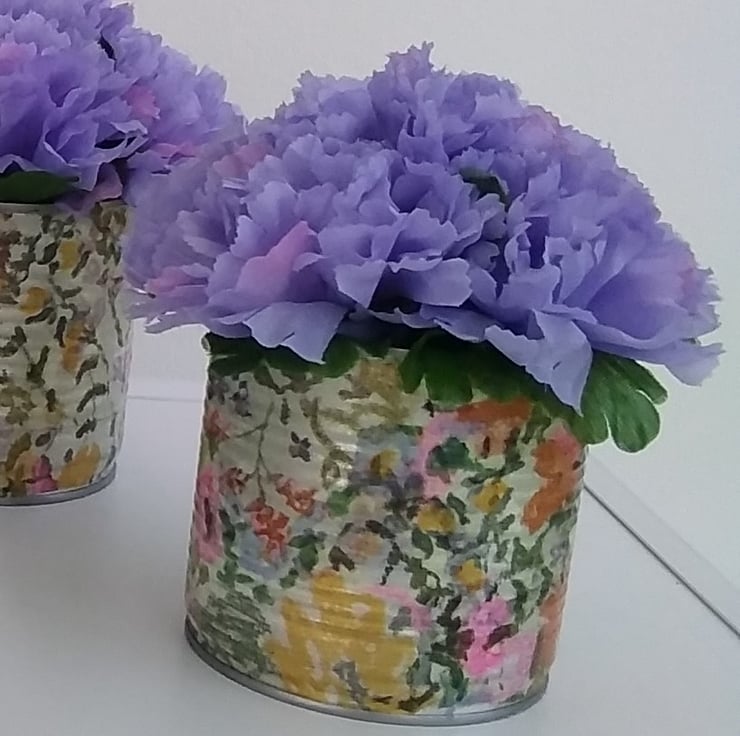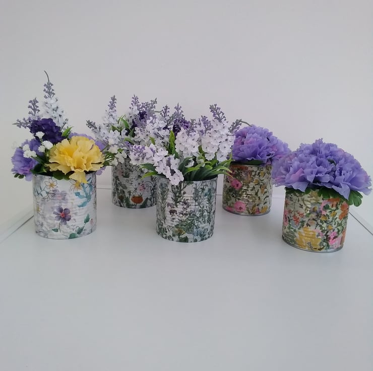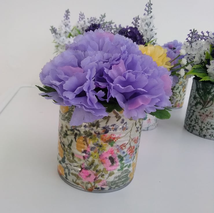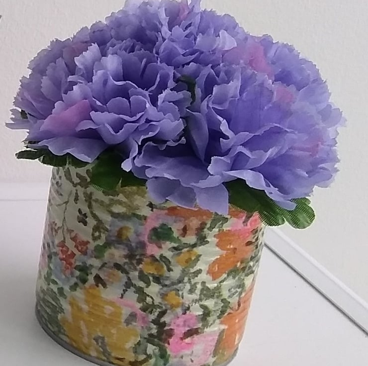Add a pop of floral charm to your home with this handcrafted tin can display. The tin has been lovingly upcycled and decoupaged with colourful floral tissue paper, giving it a fresh, vintage-inspired look. It’s filled with realistic light purple (lilac) artificial carnations – perfect for brightening a windowsill, shelf, or desk.