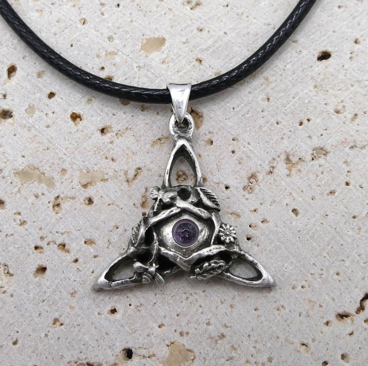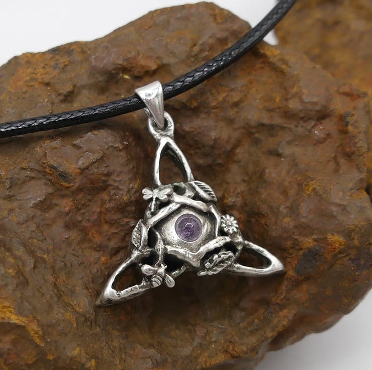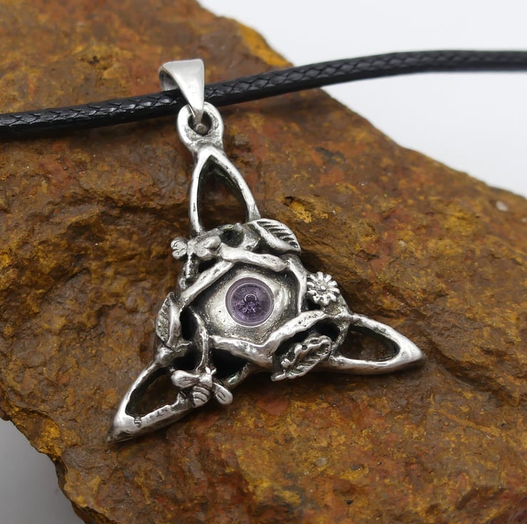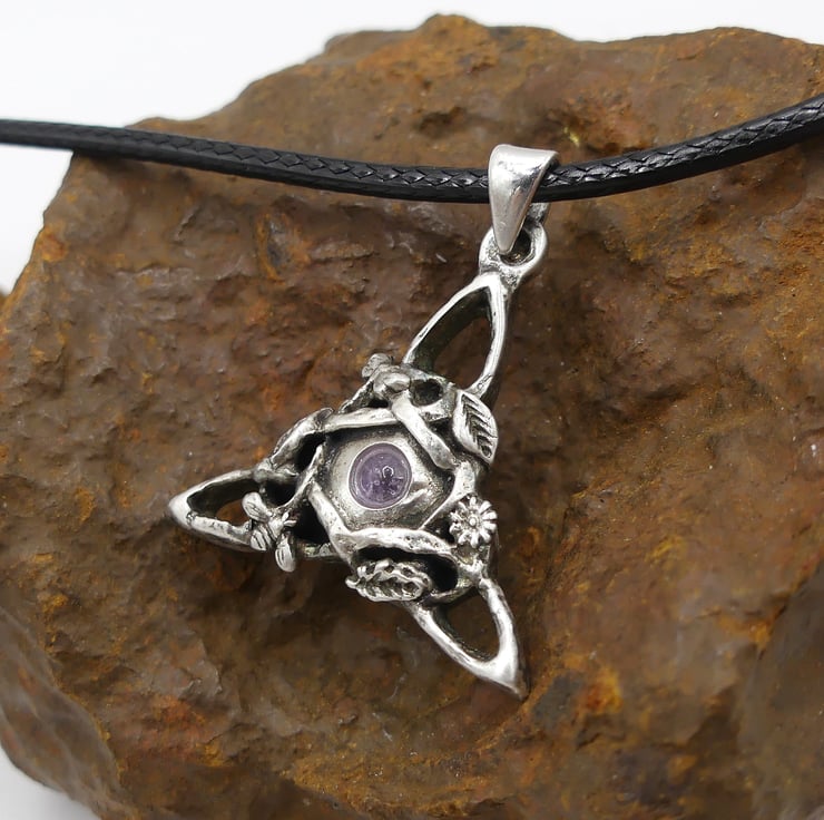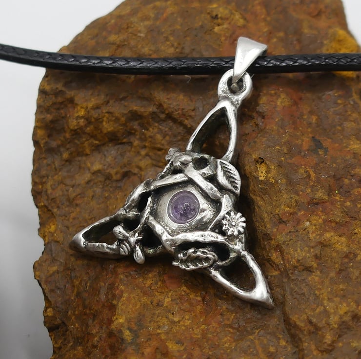 Sterling Silver Triquetra Pendant, Bee, Dragonfly, flowers Amethyst Necklace.