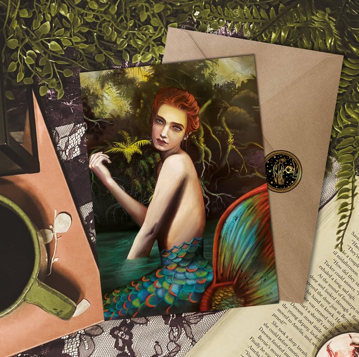 This lovely 5x7 card (blank inside), is created from my original painting of a loch mermaid called "Aberdeen." She is an elegant siren with shimmering scales and secrets to keep. I have added touches of glitter throughout the front of the card. The card is printed on thick cardstock and is cello wrapped, along with a kraft envelope and gold foil seal...for an added touch.