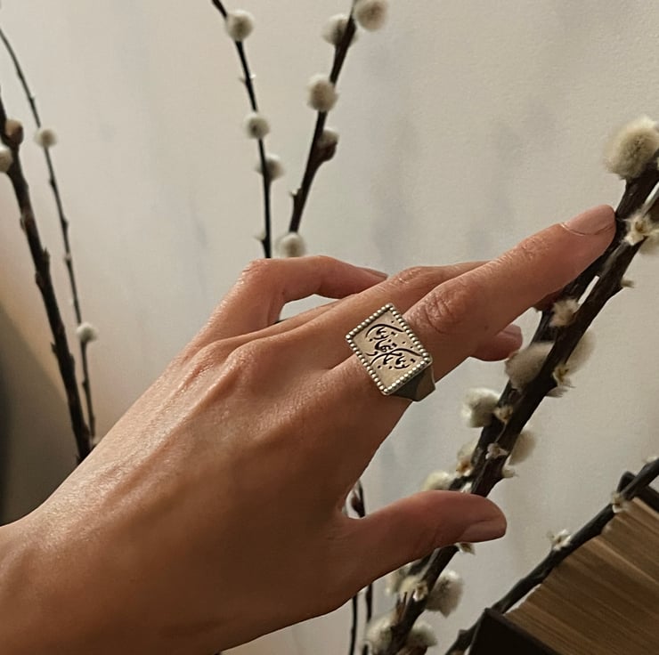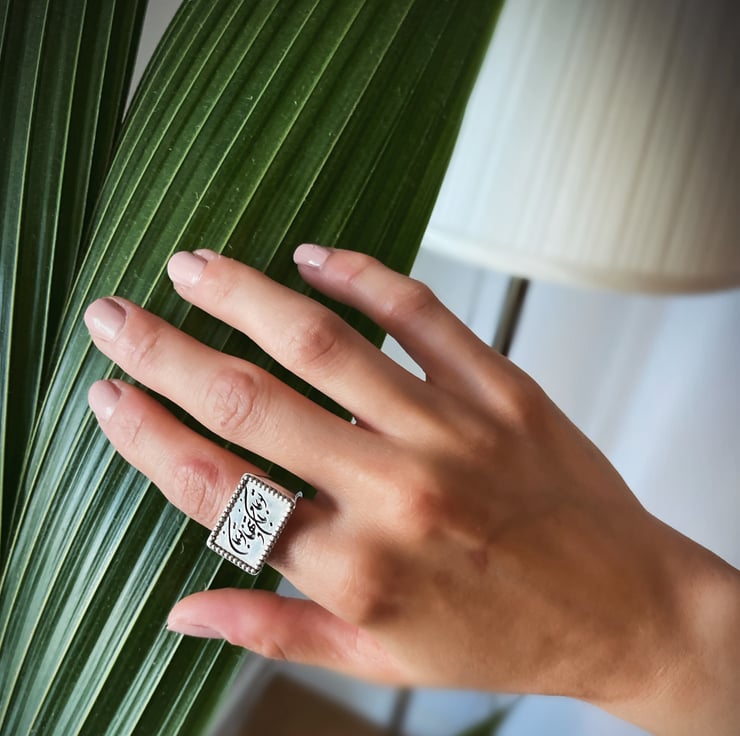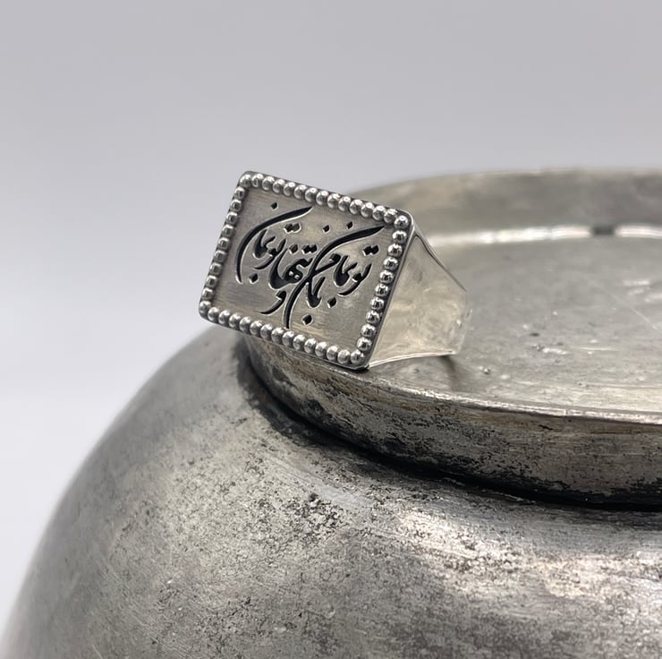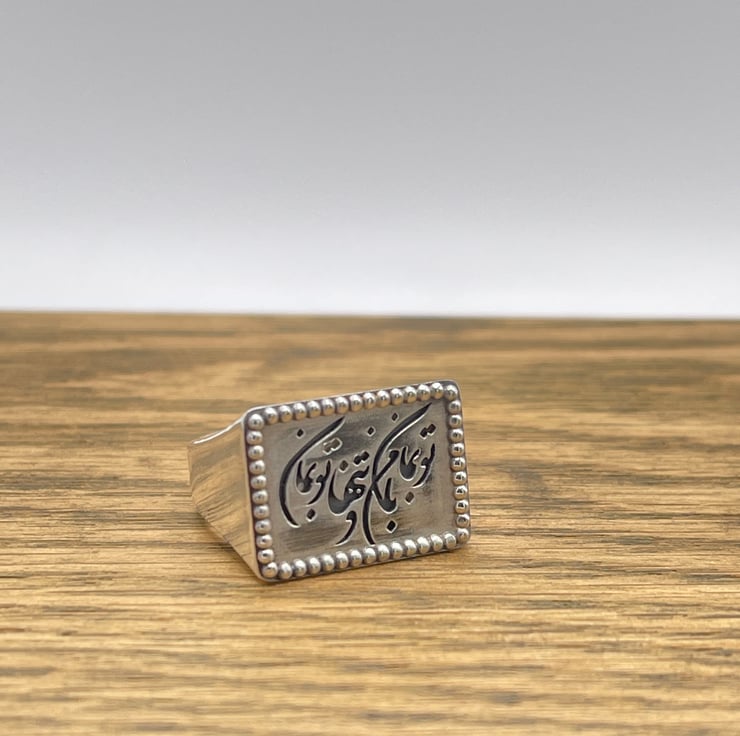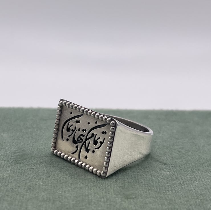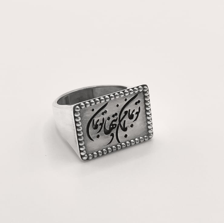 Immerse yourself in the timeless elegance of our Persian Poem Signet Ring, a testament to the rich cultural heritage and artistic mastery of Persian craftsmanship. Crafted with sterling silver, this ring features a meticulously engraved surface adorned with intricate Persian calligraphy, reminiscent of the poetic verses that have inspired generations. A lovely unique 925 Sterling Siver signet ring that anyone can wear compliments any style day and night. It has a romantic Rumi poem on Top: "You stay with me and you alone". Perfect gift for your loved one.