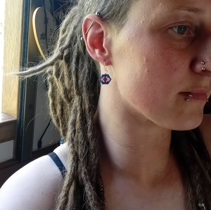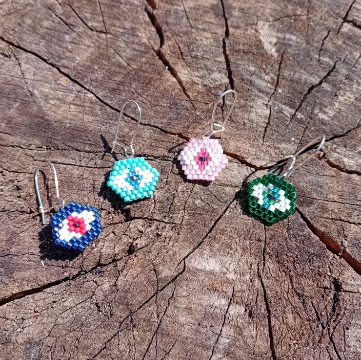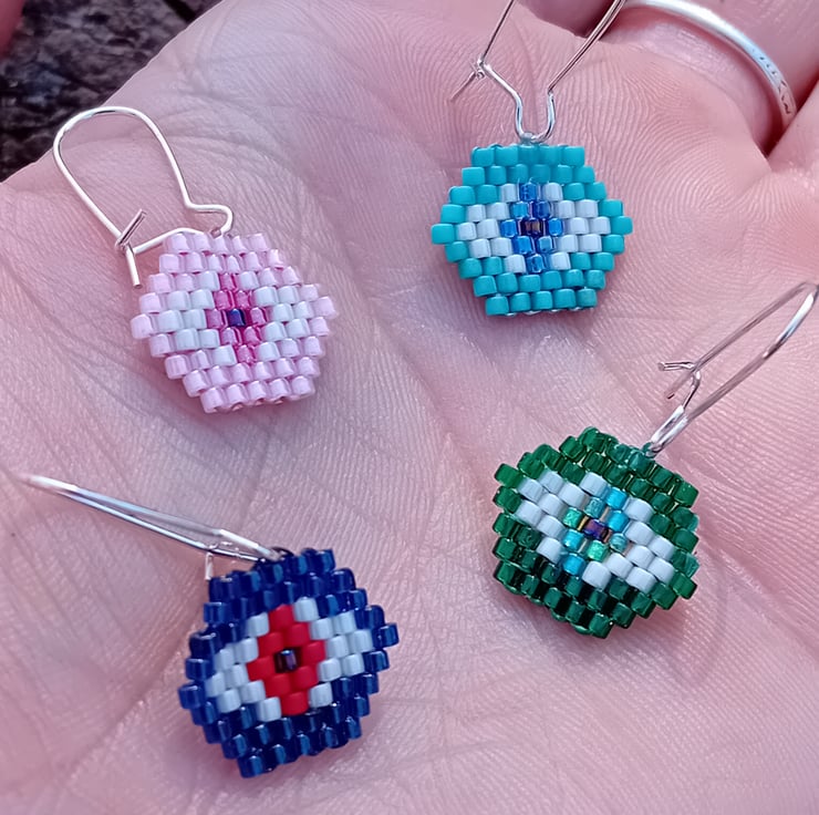 These cute and creepy eye earrings are made using a brick stitch beading method using delica beads and silver plated ear wires.
