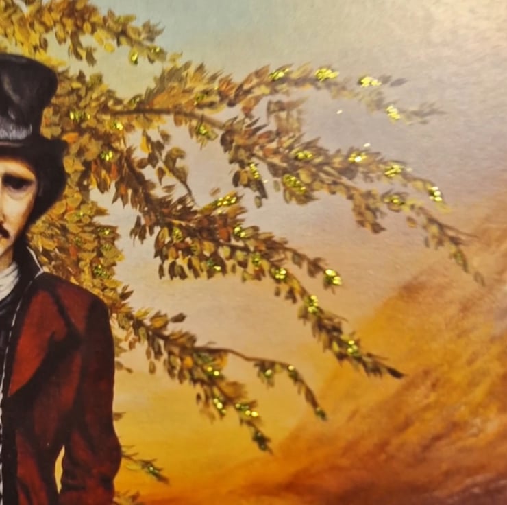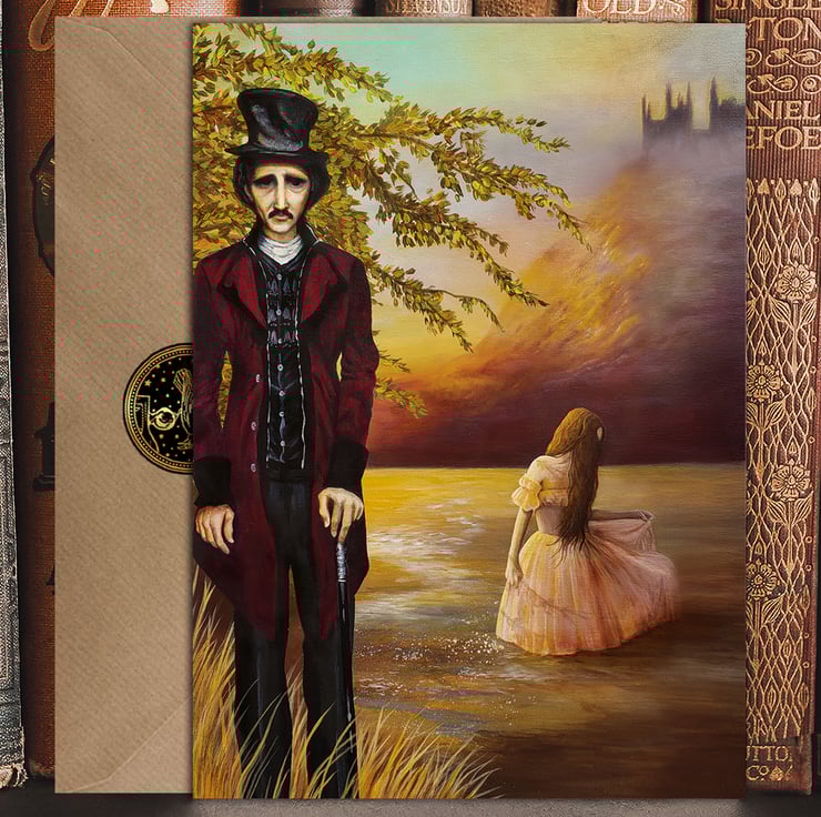 This classy 5x7 card (blank inside), is from my original painting based on one of my favorite poems my Edgar Allan Poe, "Annabel Lee." Poe was known for his somber writings of mystery and grief. This one is for all the Poe fans out there! I have added touches of glitter throughout the front of the card. The card is printed on thick cardstock and is cello wrapped, along with a kraft envelope and gold foil seal...for an added touch.