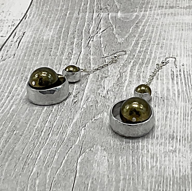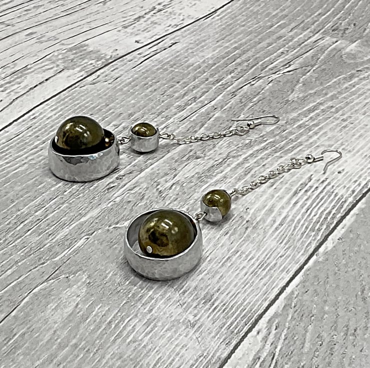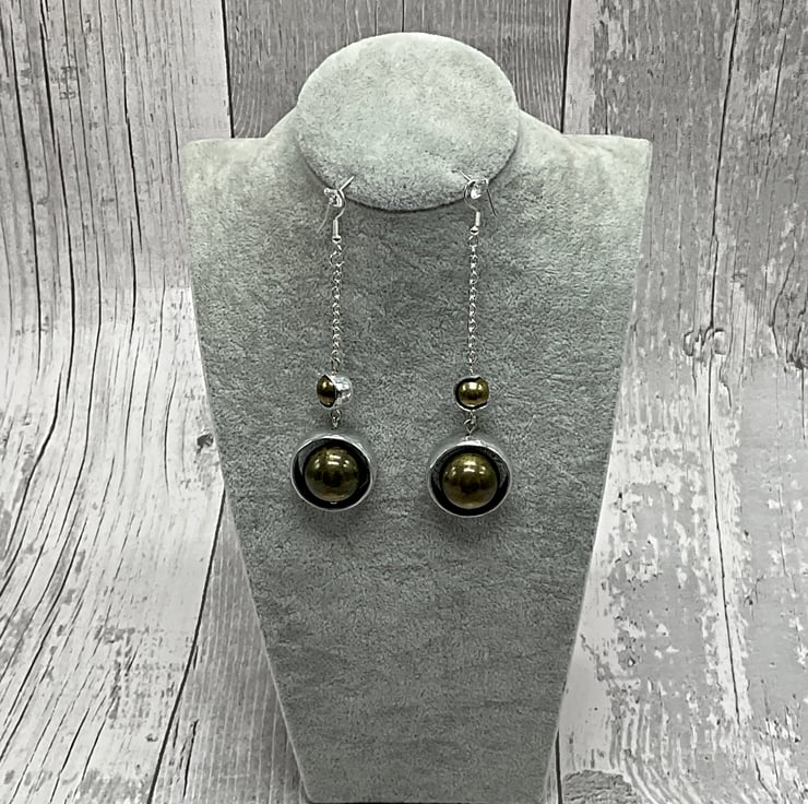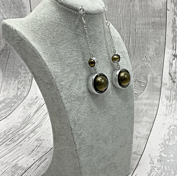 Dangle earrings made from pre-loved jewellery parts and aluminium tubing; earrings are combined into a long-tiered design with the addition of silver-plated chain. The recycled part of these is the bronze beads from two previously owned bracelets broken down and made into multiple pairs of earrings and to compliment with a matching necklace (available to buy see other listings). The largest bead is placed at the bottom of each pair being the focal point is surrounded by a cut, shaped and hammered textured aluminium tube. Above this sits the smaller bead with a small curved ‘C’ shaped aluminium fitted to the bead shape. Design is completed with a drop of chain suspended form the earlobe with ear wires. Light weight and comfortable, elegant and sustainable in design, Perfect eco-friendly purchase or gift.