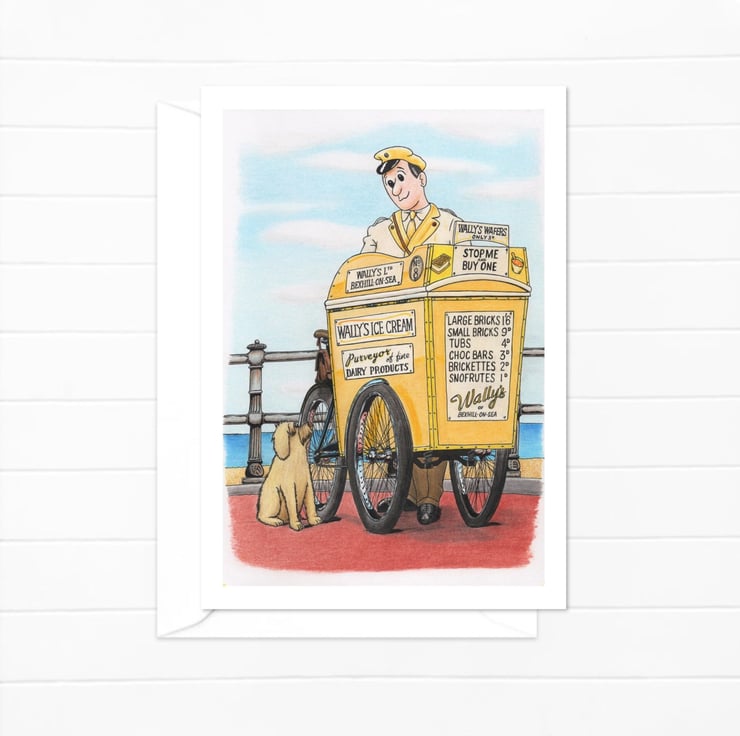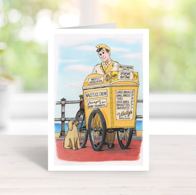 An original art greeting card featuring a hand drawn pencil illustration of an old-style ice cream seller, enjoying the company of a cute little dog. A nostalgic seaside scene, inspired by traditional postcard artwork.