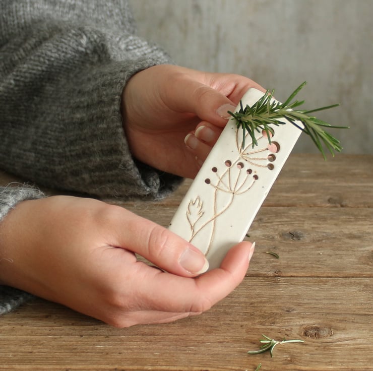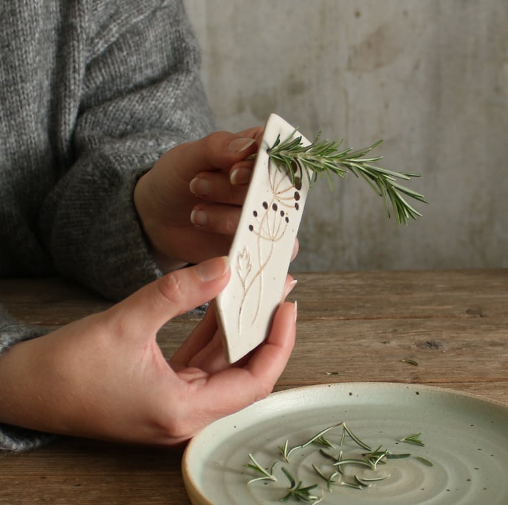 A perfect gift and kitchen tool in one. Handmade plant marker and herb stripper, featuring a hand carved cow parsley design. To store, simply place upright in a plant pot, or leave in your kitchen drawer. The herb shredder features different size holes, to use simple pull the herbs through a hole to separate the leaves from the stem. Watch our user video to see it in use.