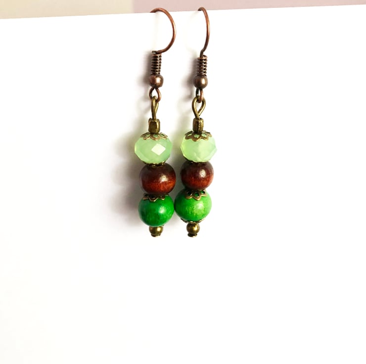 Apple green light green brown wood glass dangle drop earrings handmade using up-cycled and shop brought beads.