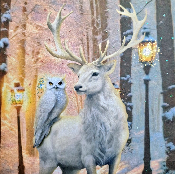 Fine Art Greeting Card, "Wintertide"- Stag & Owl with a wee touch of glitter