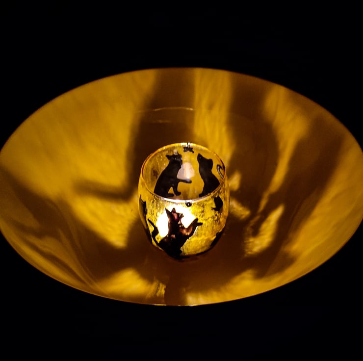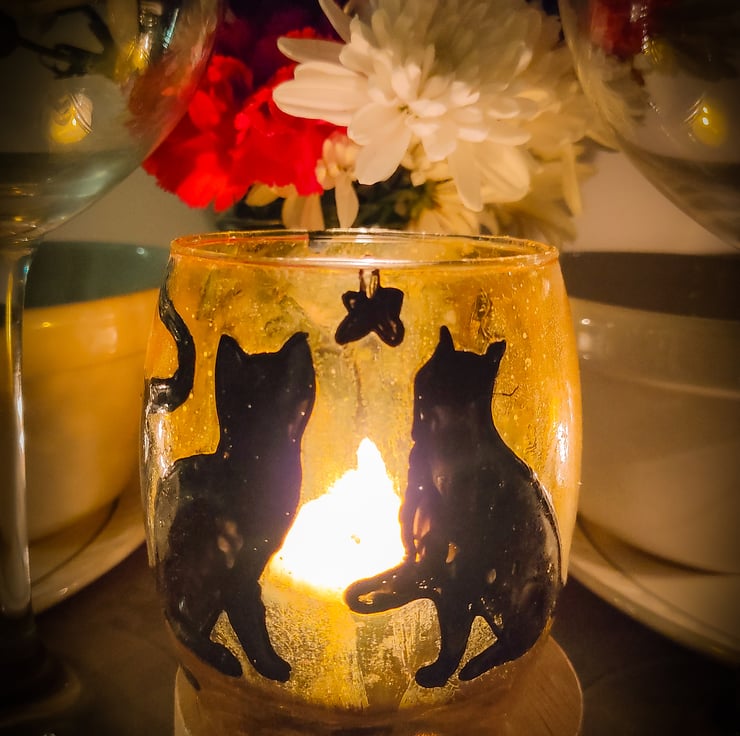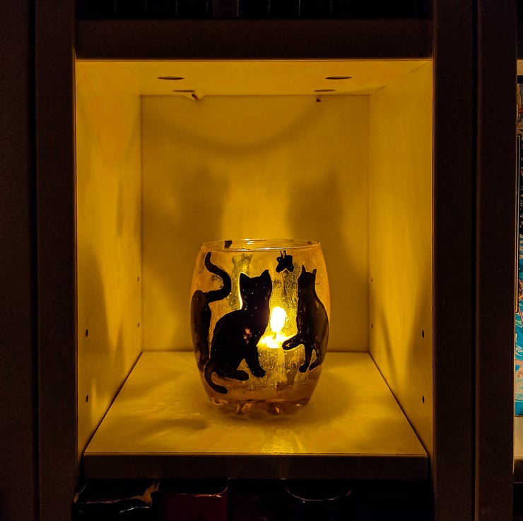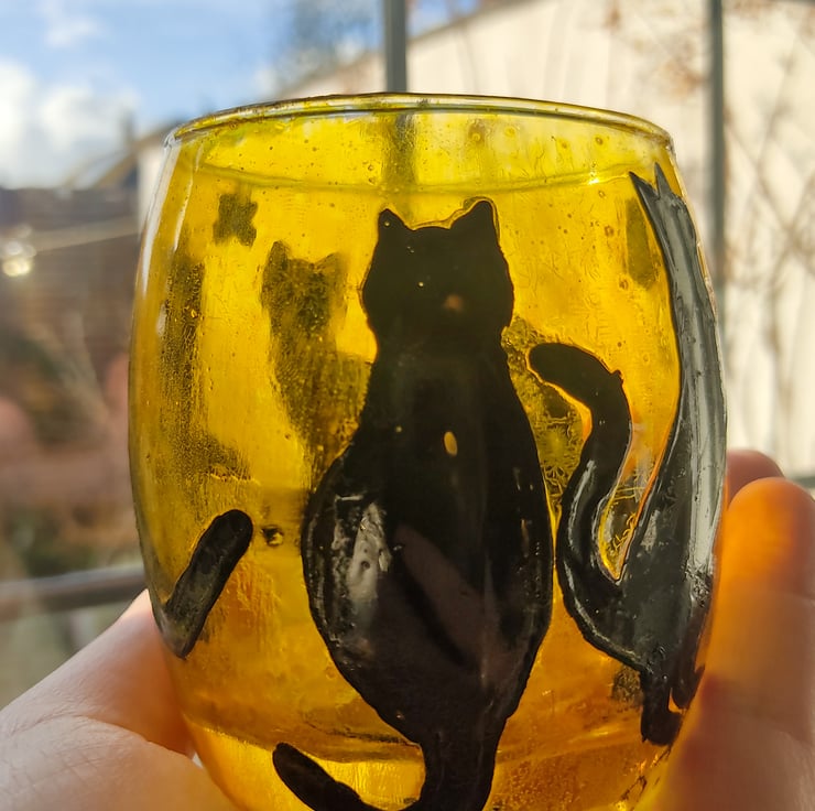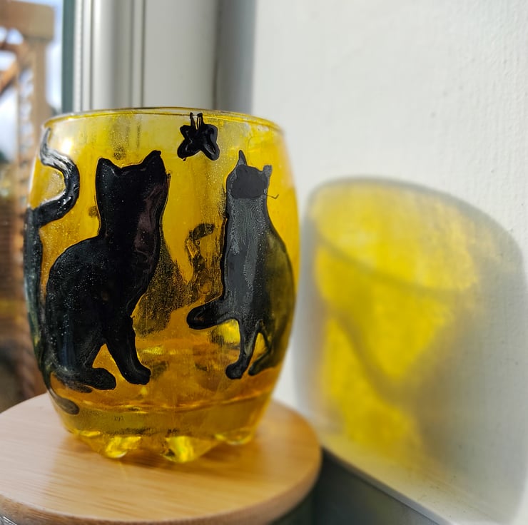 It's painted on a barrel tumble glass and covered with transparent varnish for protection. It depicts black opaque silhouettes of sitting, laying and playing cat on a transparent background. I made three of those candleholders; this one has a yellow- green background, with a fresh springy feel to it.