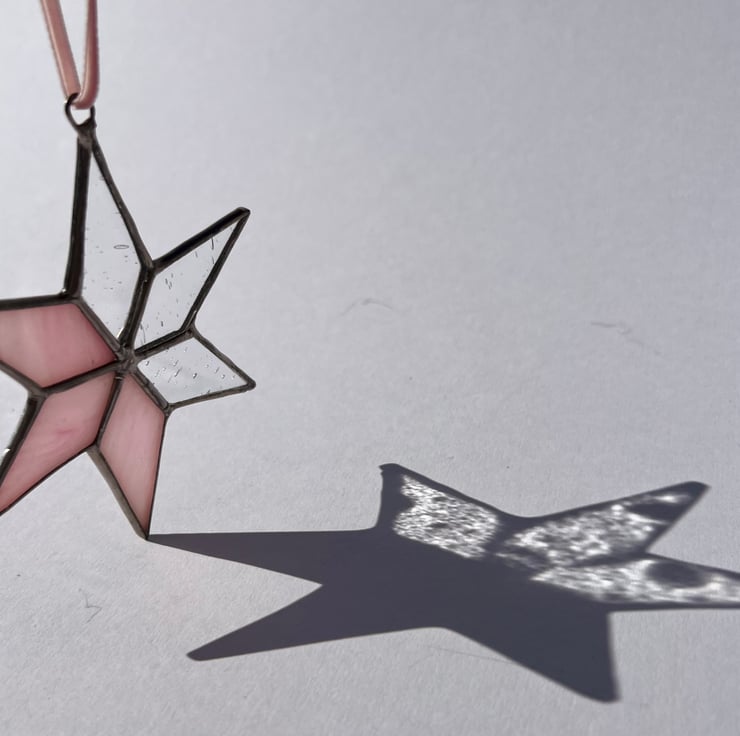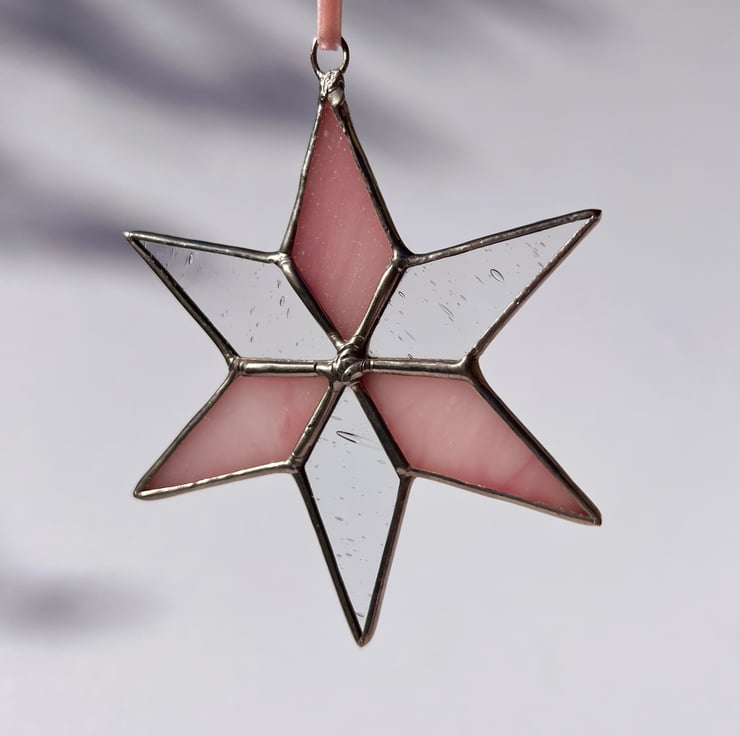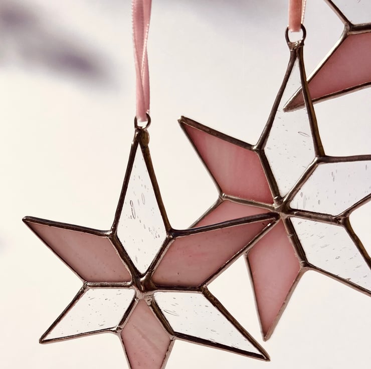 A pretty pink star decoration made from a beautiful opal pink glass contrasted with clear speckled glass. There is an option of alternating pink and clear points, or a half pink, half clear star. Delicate and elegant, these make great gifts but you might just love them too much to give away!