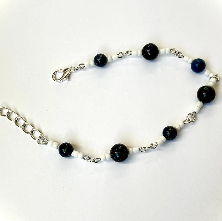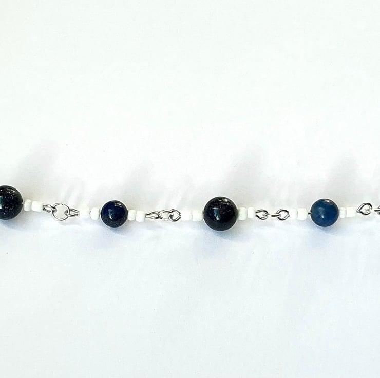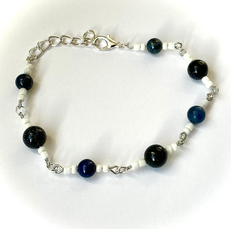 Bracelet made using gemstone beads in shades of Blue. Deep Blue Goldstone and Lapis Lazuli beads with contrasting white seed beads.