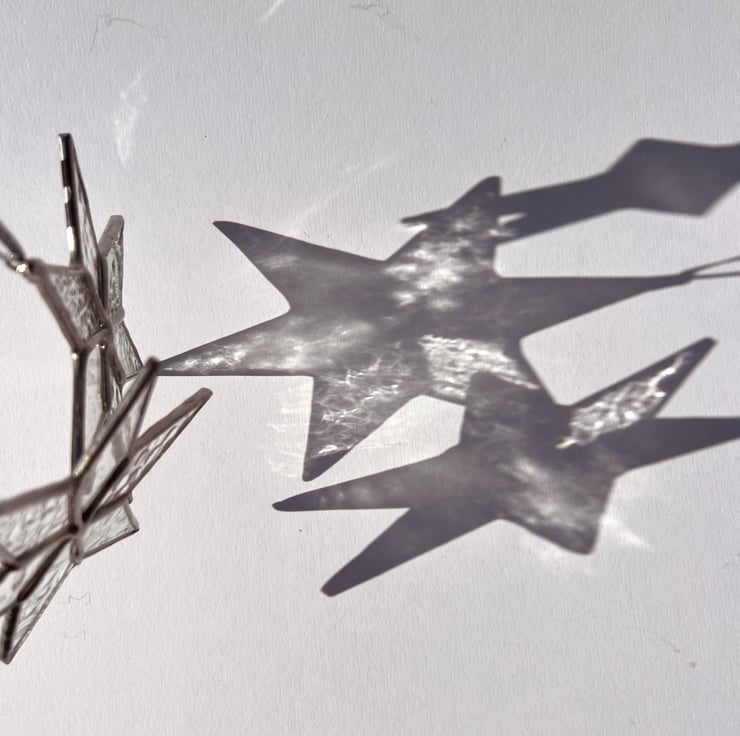 A stained glass star decoration made from a beautiful range of textured glass that make these stars sparkle! Finished in a shiny silver solder with a fine glittery silver ribbon.