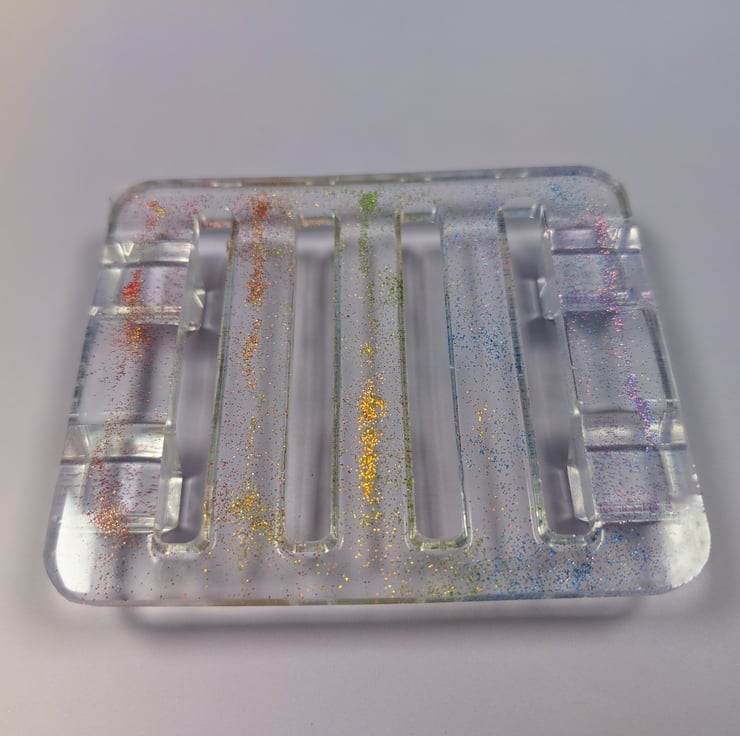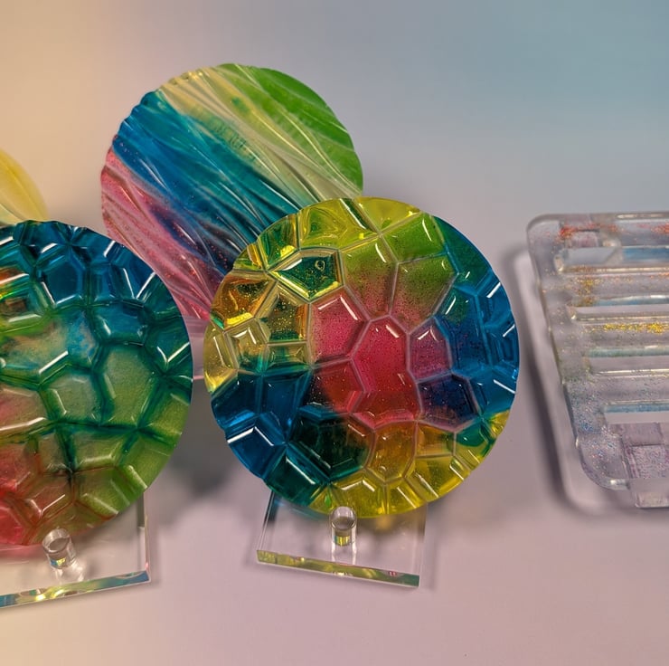 This set started as a way to use some leftover resin in a new set of moulds. Once poured, the textures called out for some colour and the rest is history. It turned into a lovely Pride-inspired set which will look cheerful in any space.