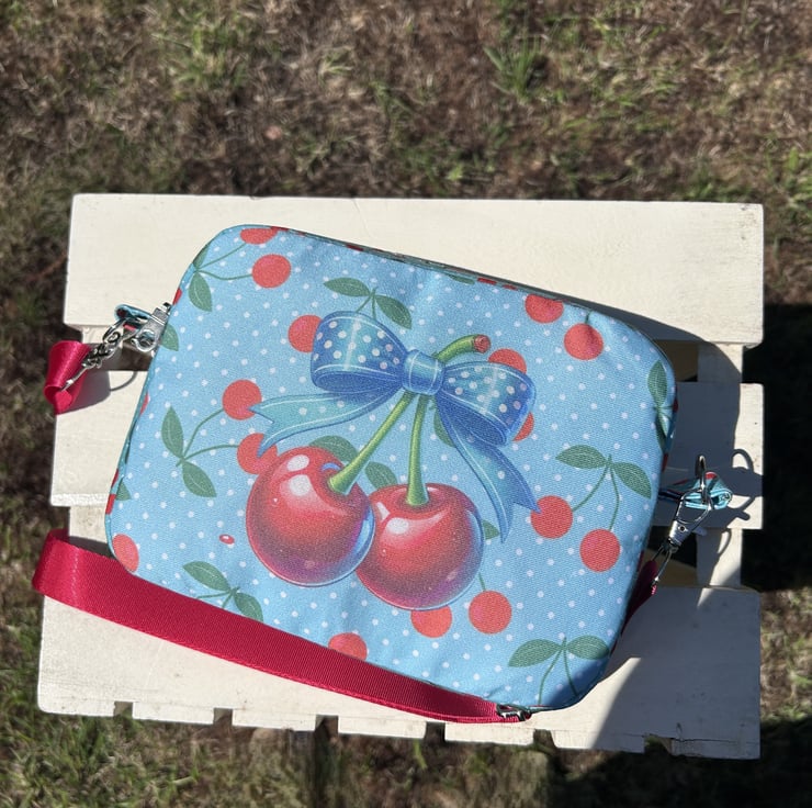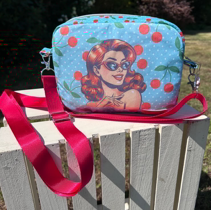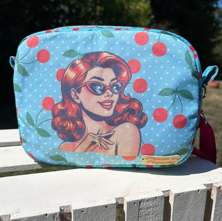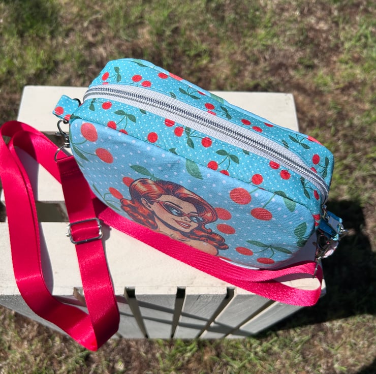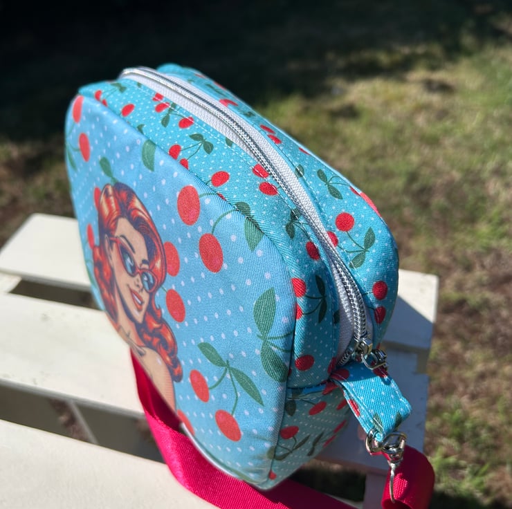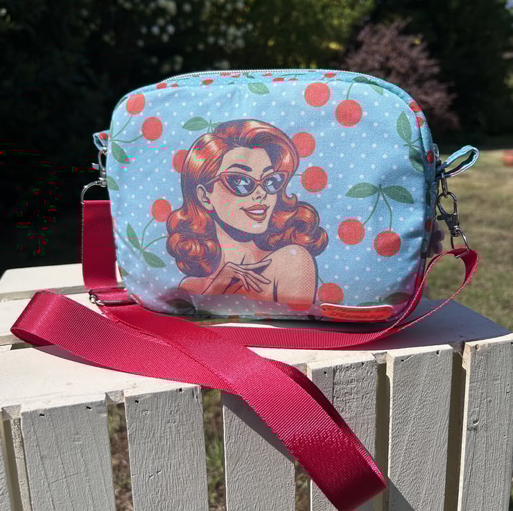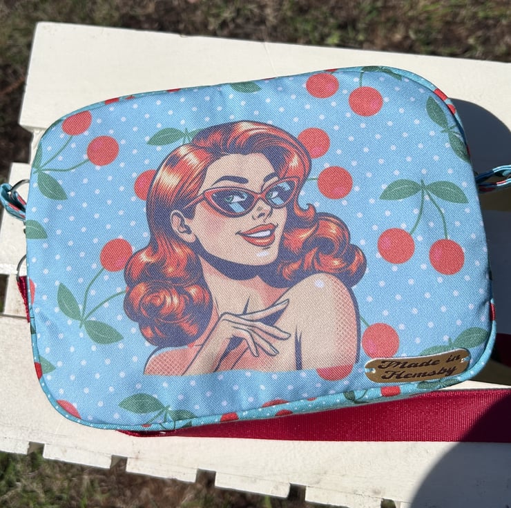 Red and Blue toned Bag: Features a red-headed lady with long hair and red framed sunglasses on one side, and a pair of cherries tied with a polka dot ribbon on the other.