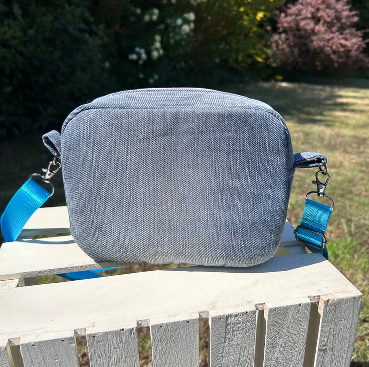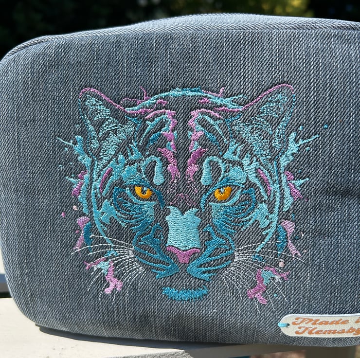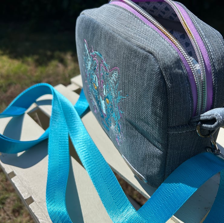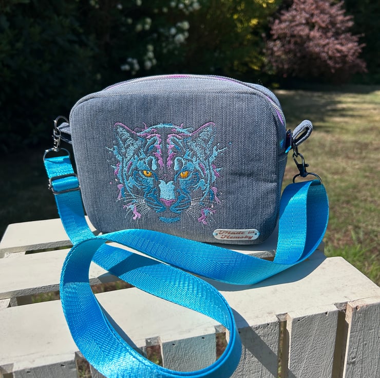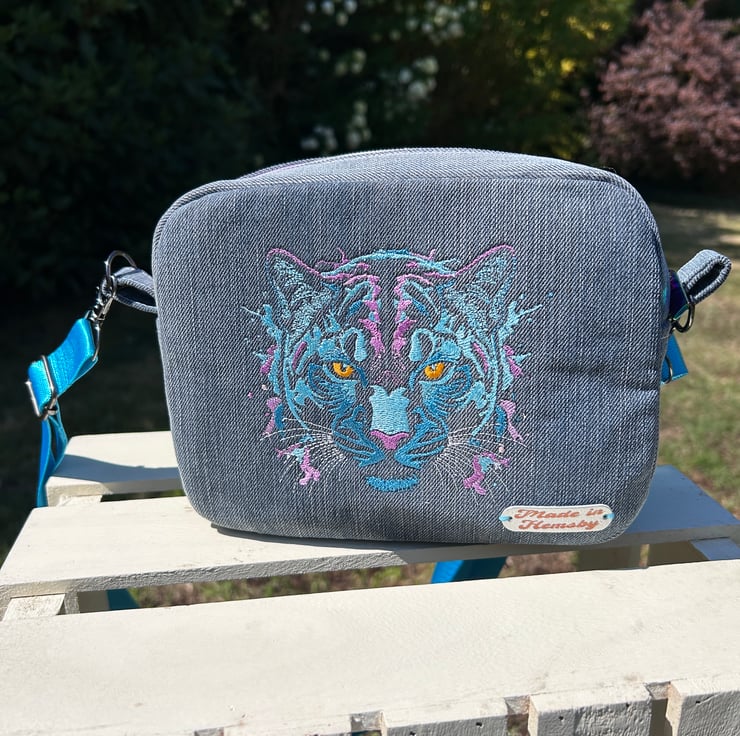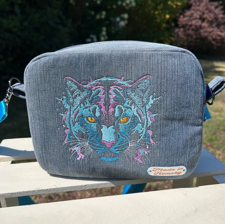 This really versatile and stylish bag is created using upcycled denim, lined in a patterned cotton fabric. The bag is embroidered on one side with a beautiful tiger using a blue and lilac colour pallette.