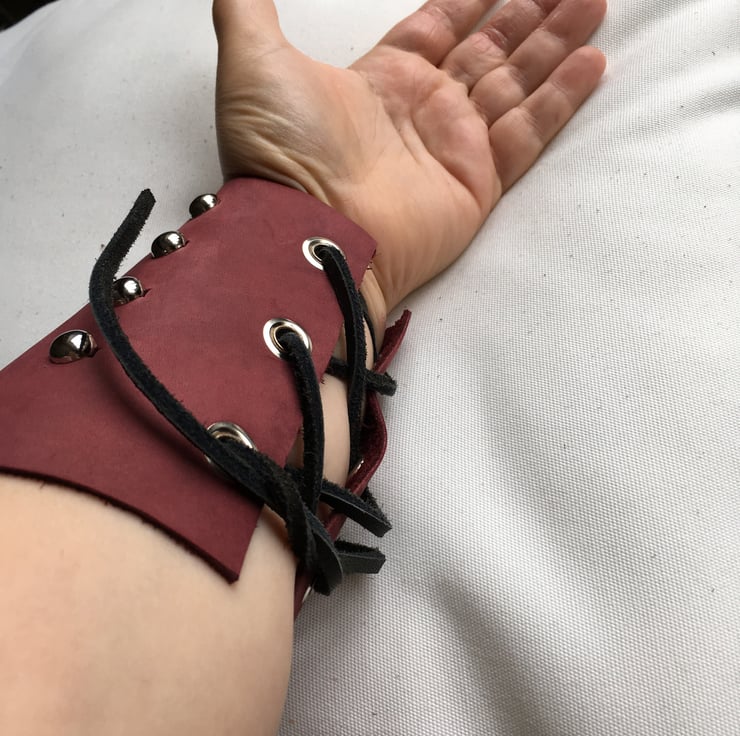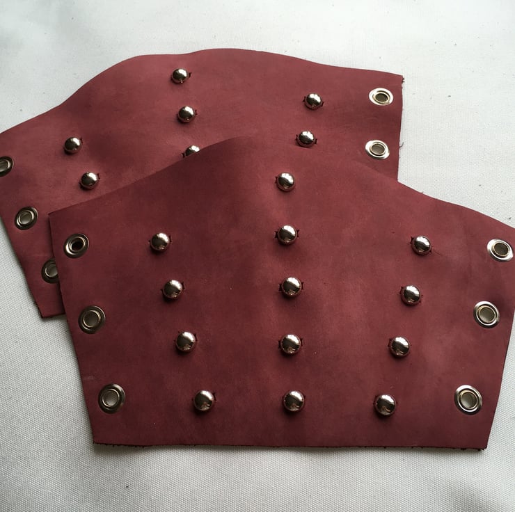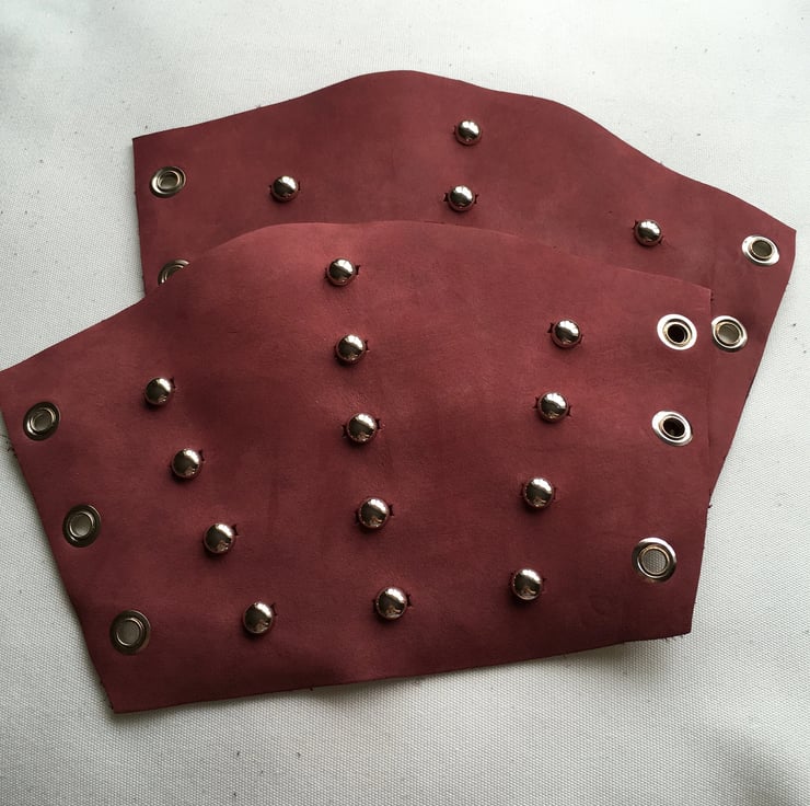 Pair of mauve / burgundy coloured leather bracers with 3 rows of nickel spots (sold with lacing) The leather is a soft 1.5 oz weight. Last photo is close up of the leather so you can see the colour