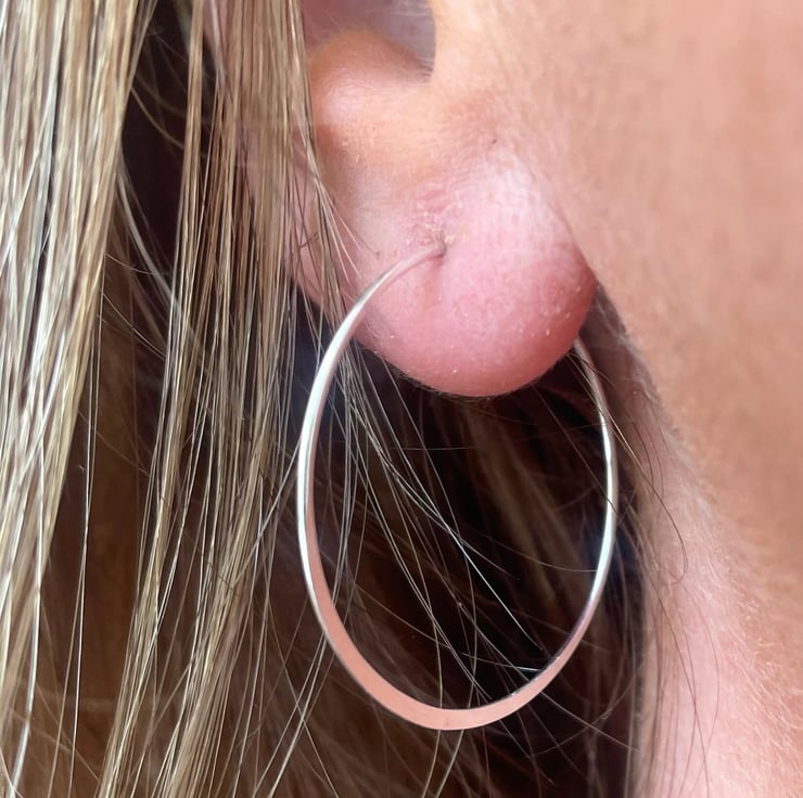 Sterling silver hammered flat at the bottom, 25mmhoop earrings. Free gift box tied with ribbon.