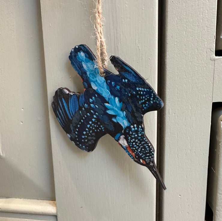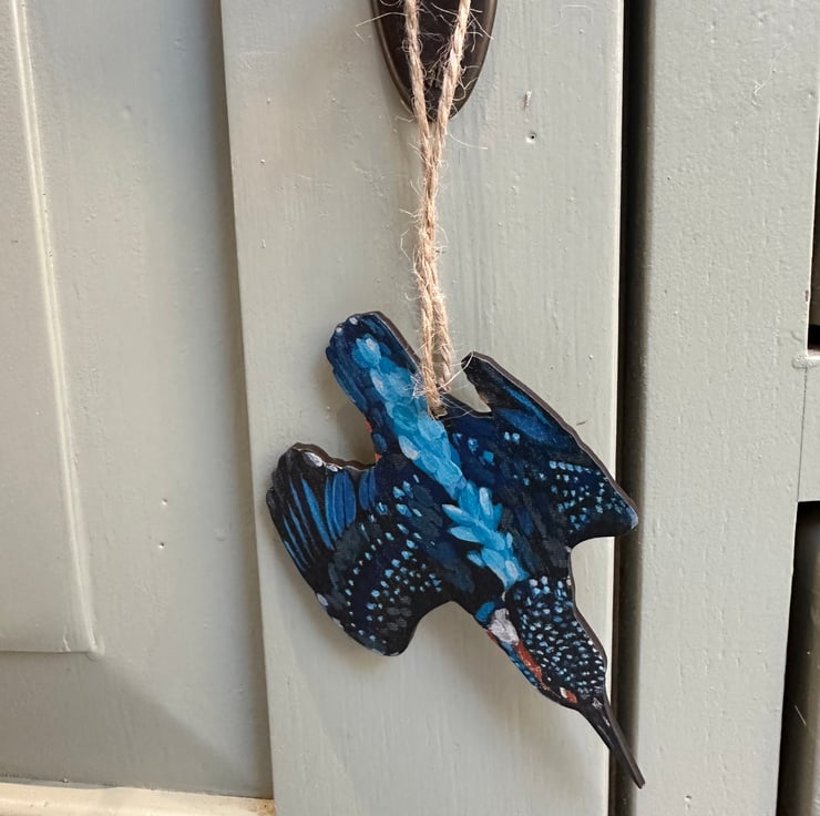 Beautiful hanging wooden decoration with original Kingfisher design and laser cut to the outline of this striking bird to make it look like a realistic miniature Kingfisher diving down into the river to catch a fish.