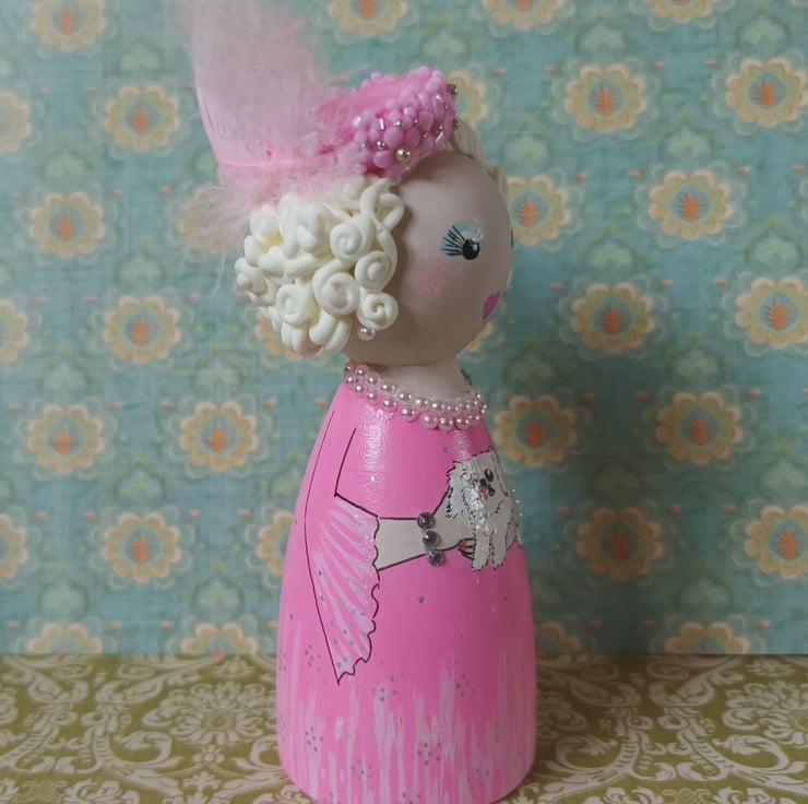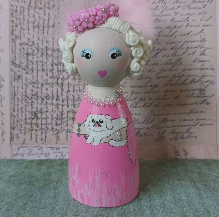 Novelist Dame Barbara Cartland pink and fabulous peg doll.
