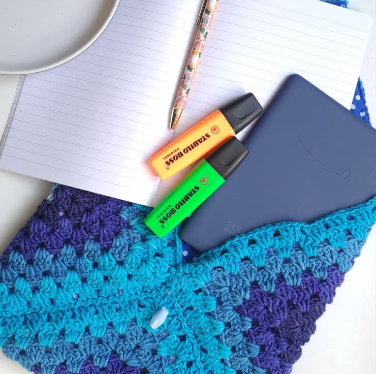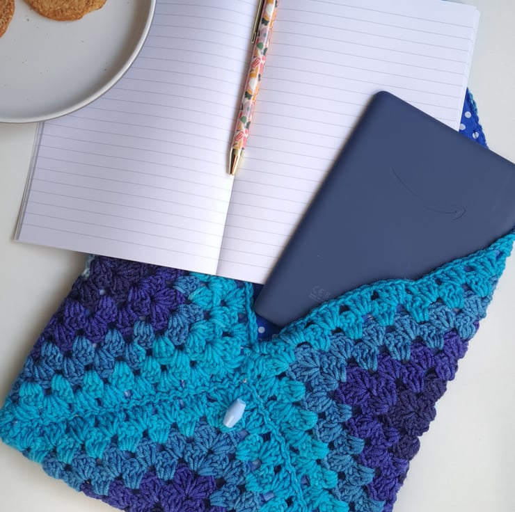 This hand made sleeve can be used to protect your Tablet or Kindle when on the move. It can safely hold a notebook, pens, lip balm and any other small accessories. The sleeve is fully lined to not just protect the contents but to add a little more colour.
