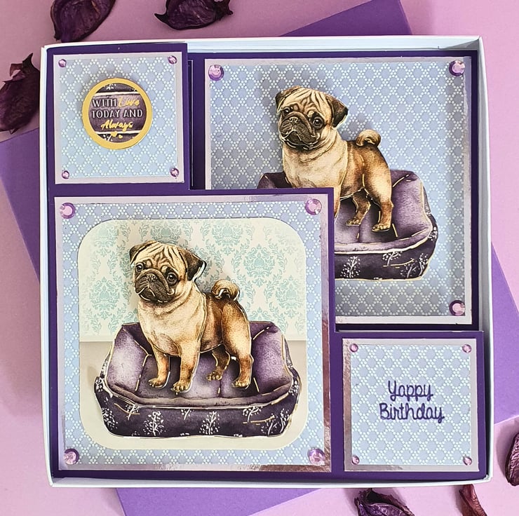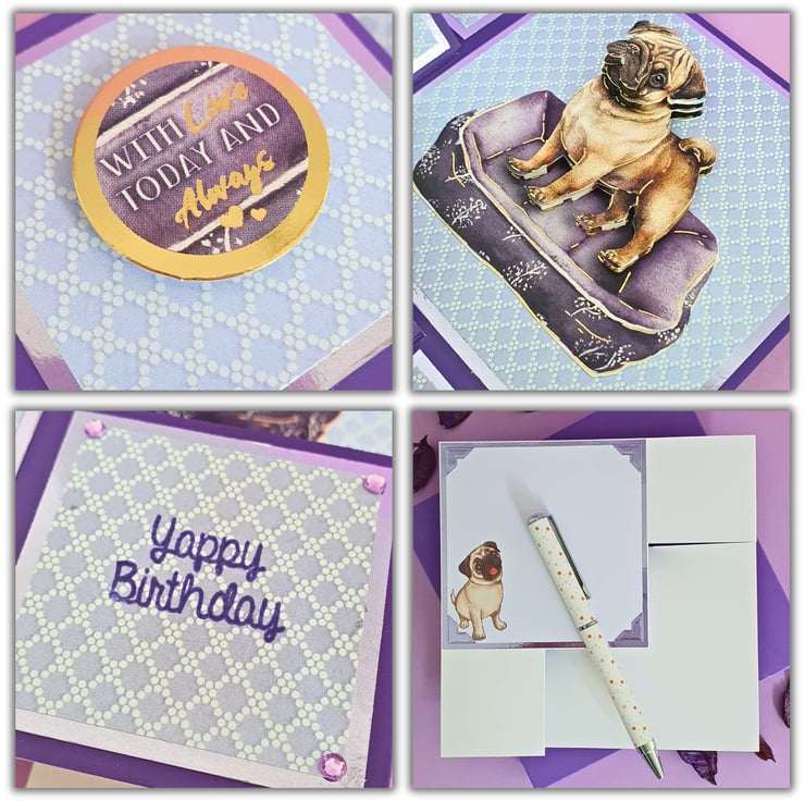 It consists of a purple card base, cut in a foldback stepper shape, to create 2 large and 7 small squares. Every square is layered with Lilac mirror card & matching patterned paper. Both large squares accommodate the image of the pug dog, decoupaged with multiple layers. The sentiment "With Love Today And Always" decorates the top left small square, while the wish "Yappy Birthday" is stamped on the bottom right. The card is embellished with matching lilac craft gemstones. At the back, a square panel of coordinating insert will provide you with enough space to write your message and wishes.