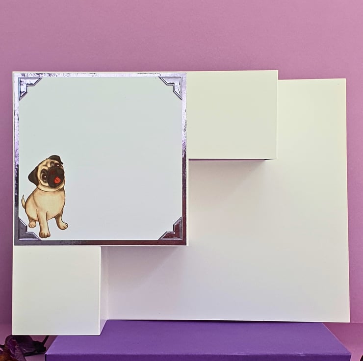 A stunning decoupaged birthday card featuring a pug dog, a perfect keepsake for a pug owner or any dog lover!