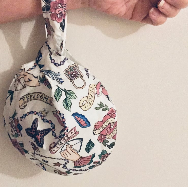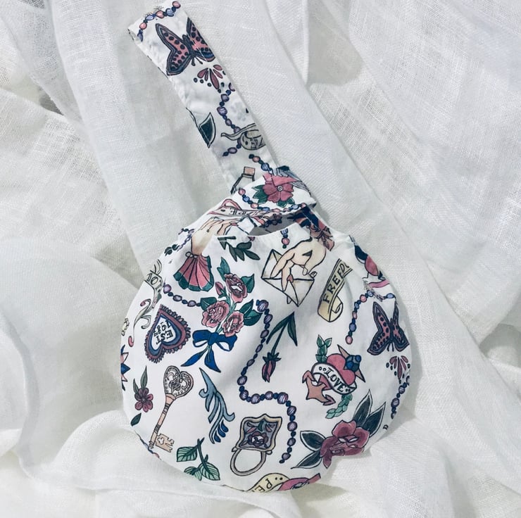 Sweet little Japanese knot bag, useful for holding confetti, lipstick etc. at a summer wedding, just loop your wrist through the longer handle. Made from Liberty’s beautiful Tana lawn cotton fabric depicting love tattoos.