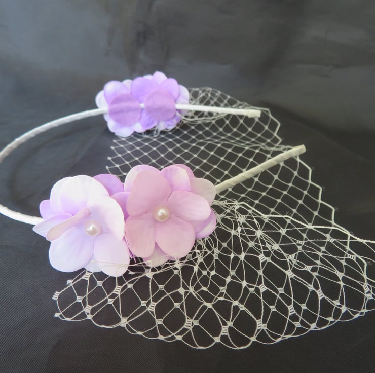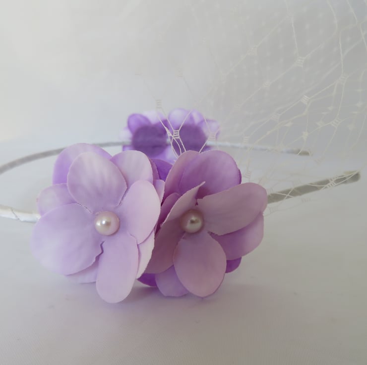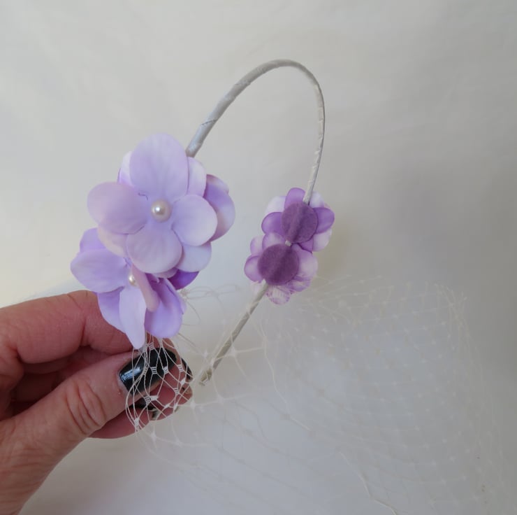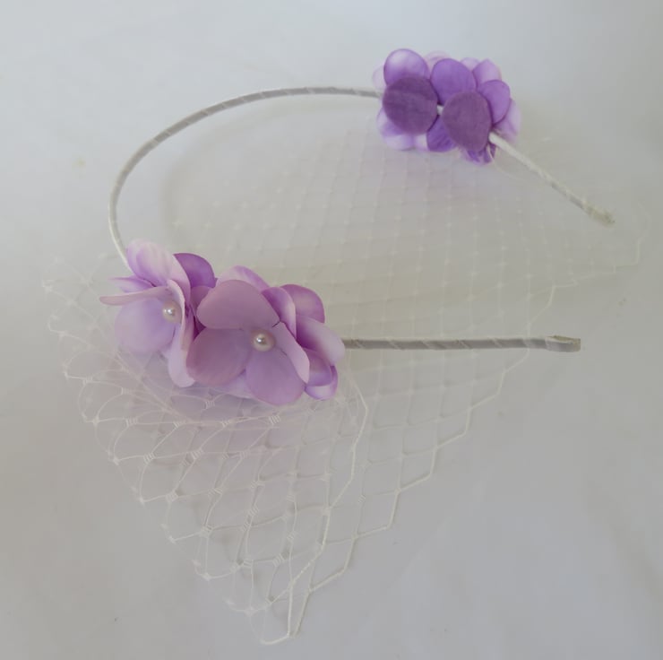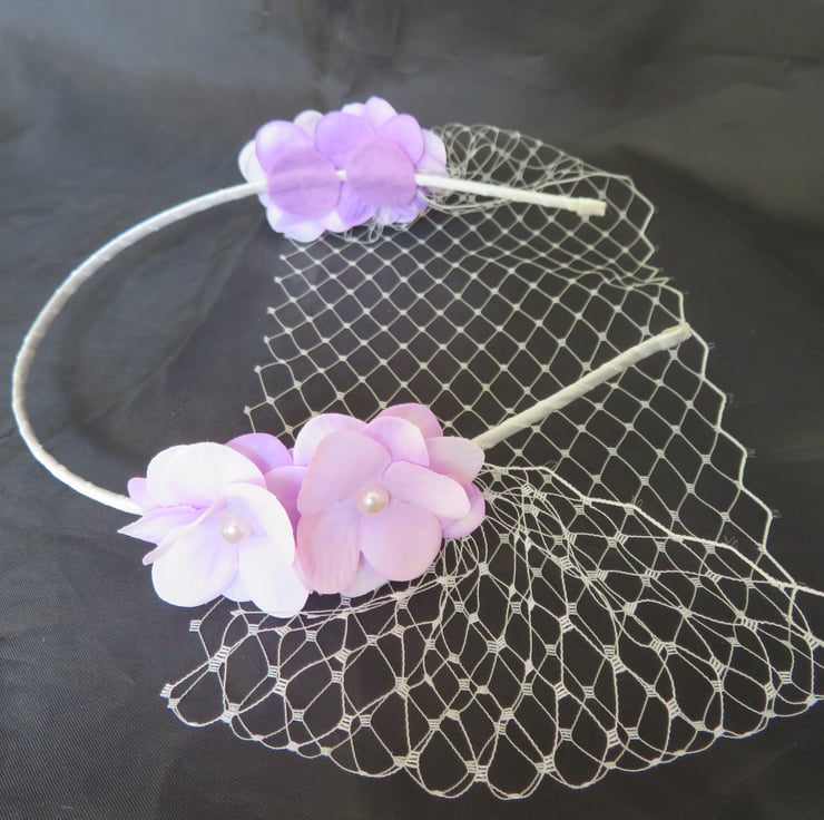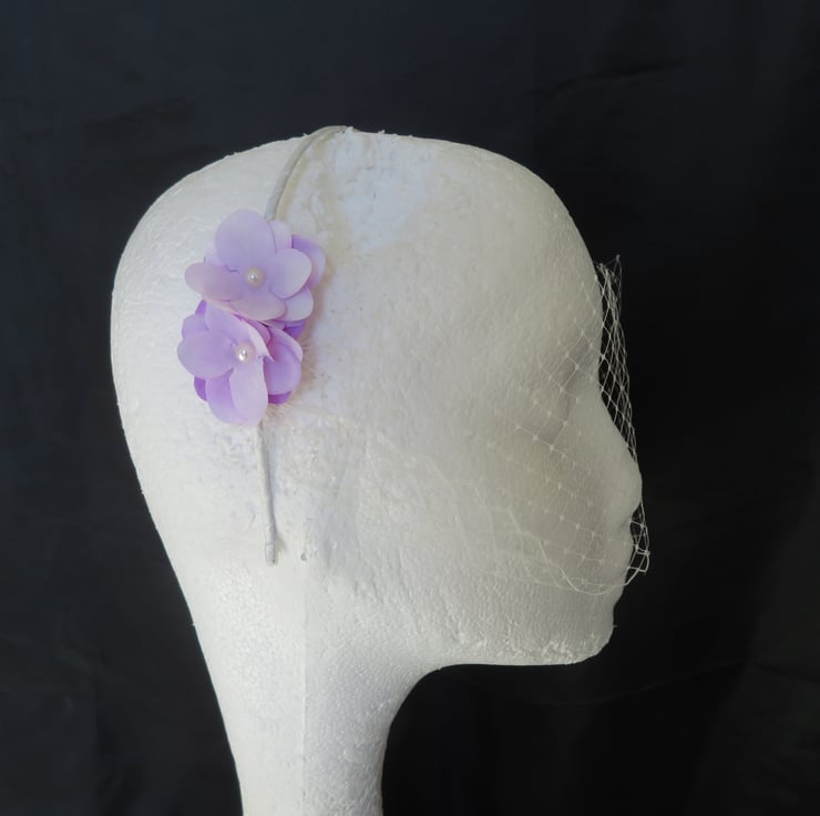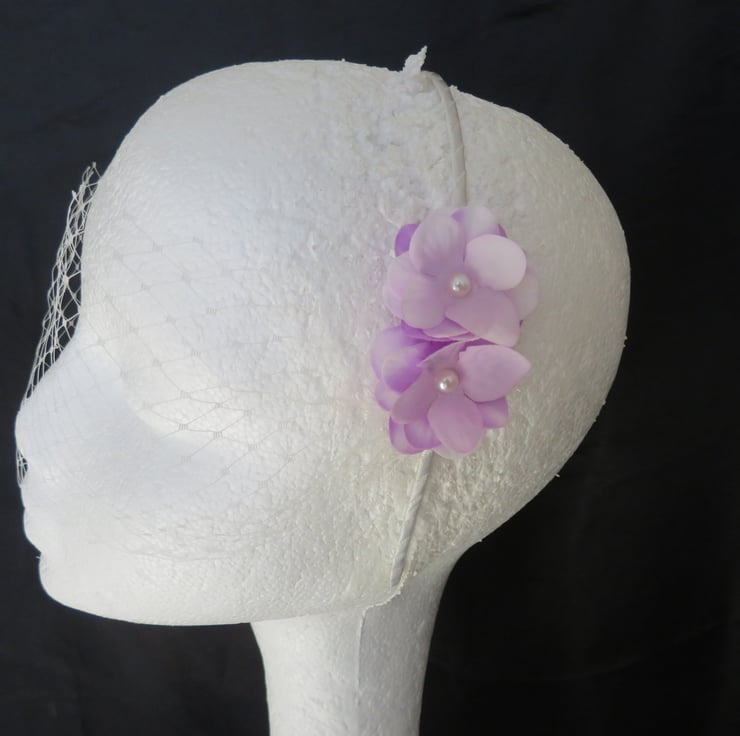 This is a new design and is a cute and pretty narrow style bandeau veil on a headband in ivory & lavender lilac.