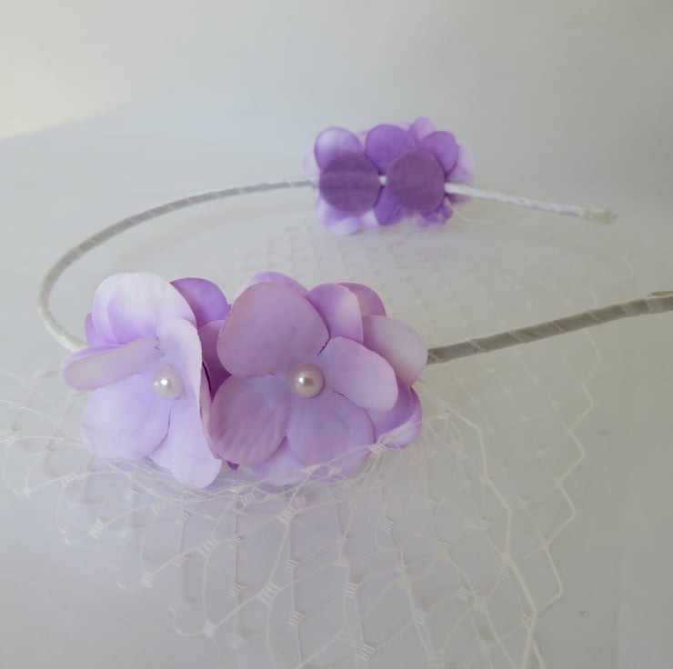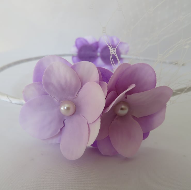 Finished with two lavender/ lilac Hydrangea flowers on each side, with an ivory pearl in the centre of each.